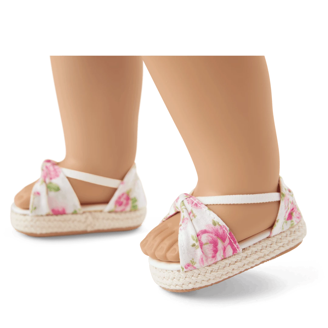 LoveShackFancy Garden Party Sandals for 18-inch Dolls: Floral espadrille sandals with the straps cinched to create beautiful bows