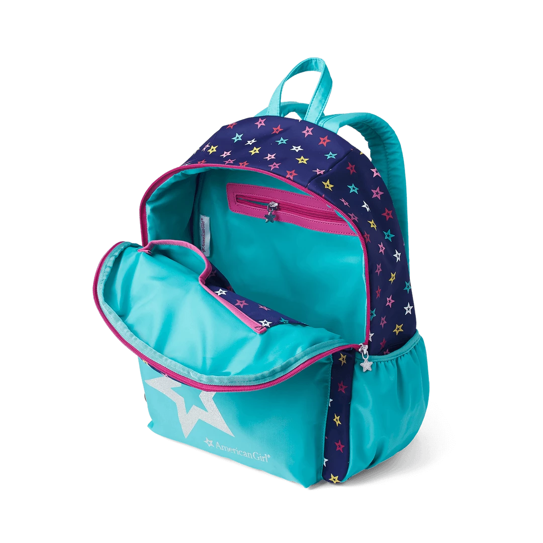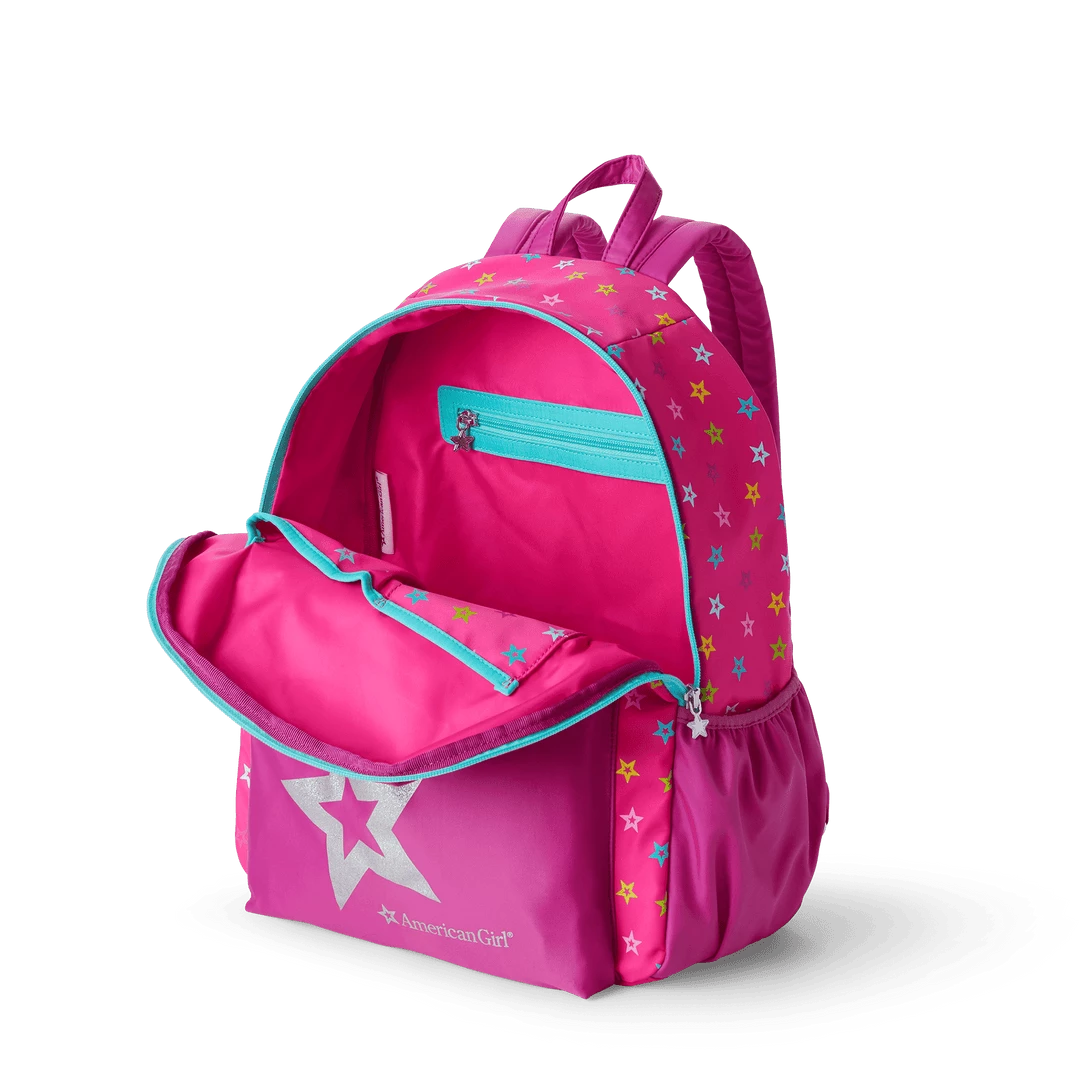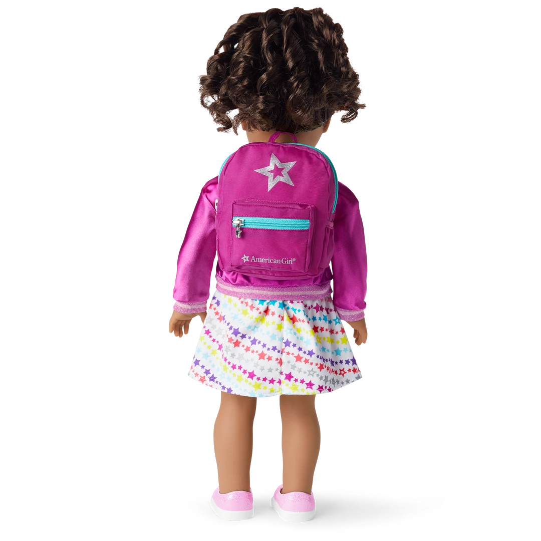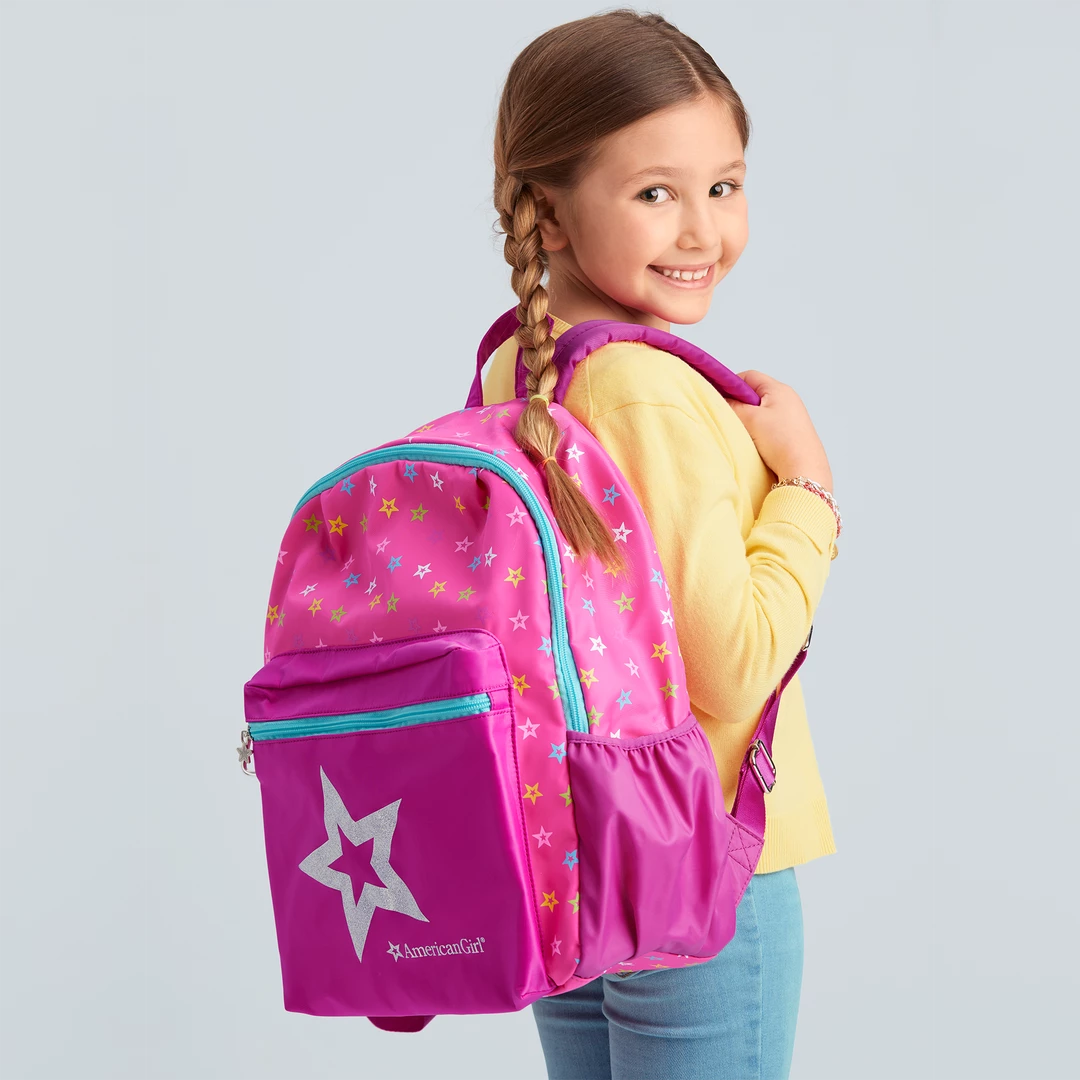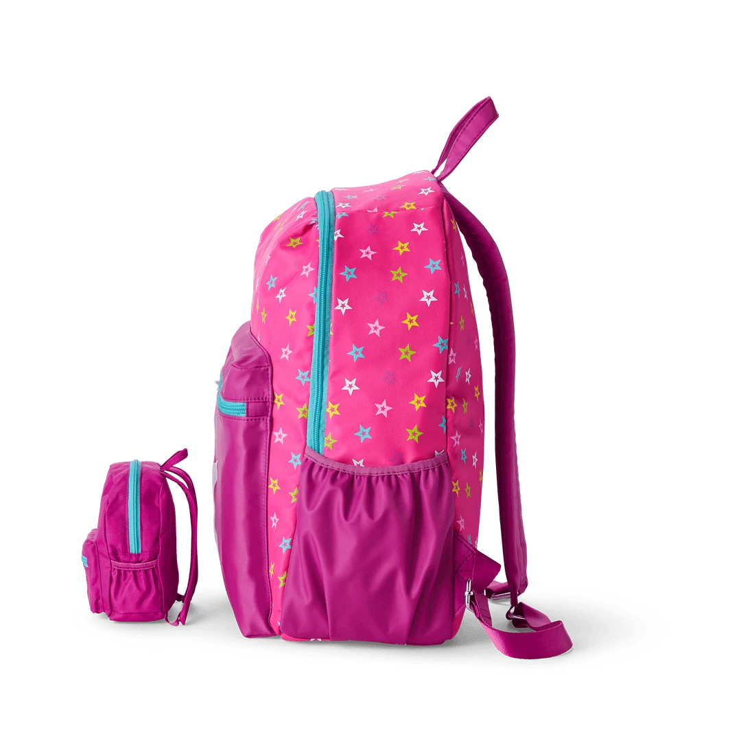 Your girl and her doll will be all set for school in style with coordinating backpacks! Girls can choose from pink or starry blue, to go along with the pink doll-sized version. Backpack for girls (W: 5″ x L: 11″ H: 15″) features a front pocket, main zippered compartment, adjustable padded shoulder straps, water-bottle holder, two inside pouches, and a clip to attach the doll backpack.