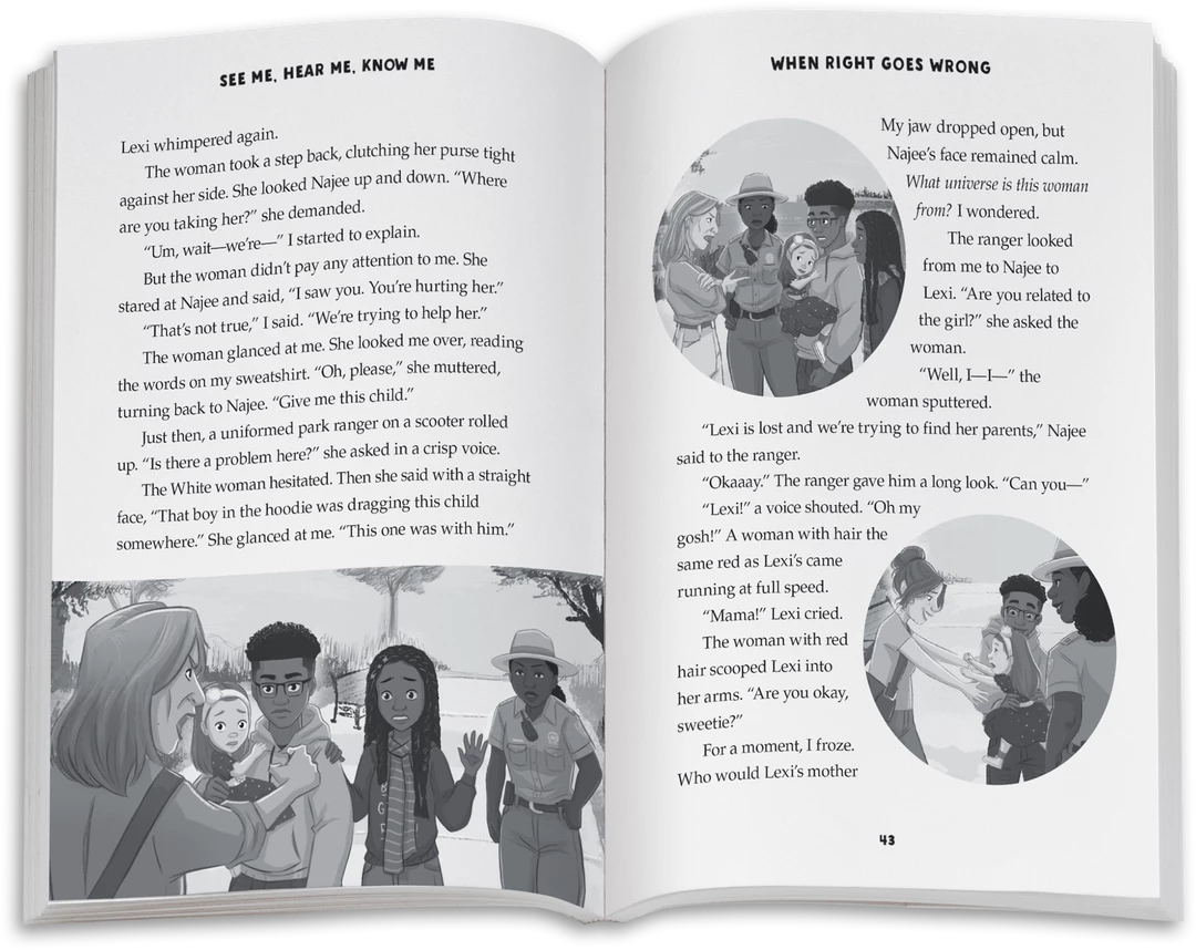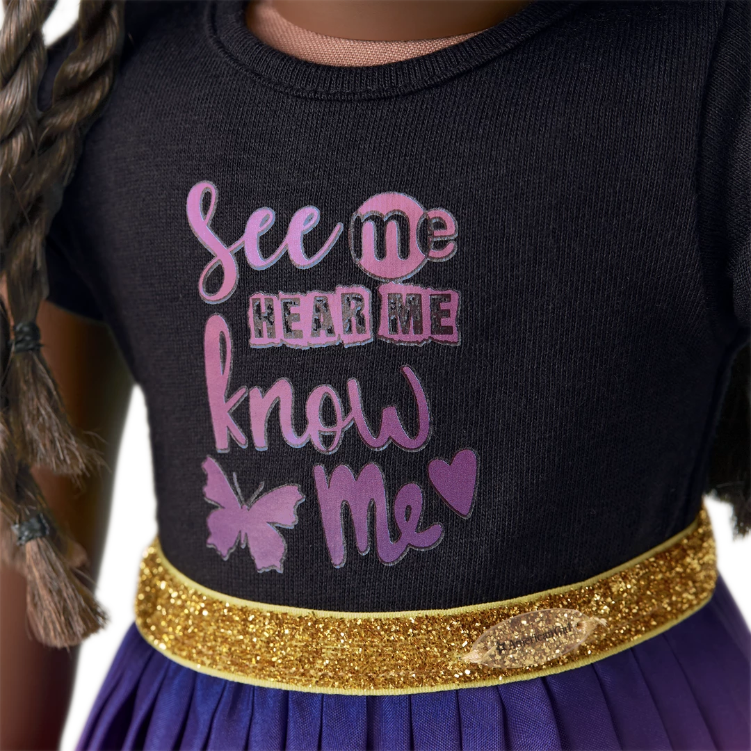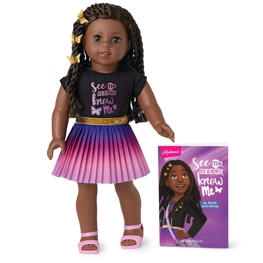 Makena™ Doll & Book: An 18” Makena™ doll with brown eyes and medium-length dark-brown textured hair that comes in a twisted style, plus her introductory outfit and Makena’s See Me, Hear Me, Know Me book that includes ideas for addressing racism, real girl profiles, and reader questions