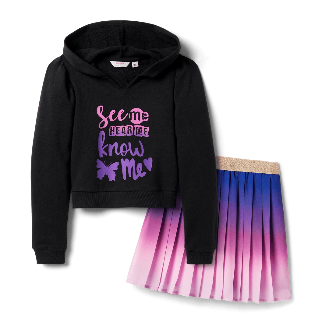 American Girl® x Janie and Jack: Makena’s™ Black Crop Hoodie for Girls: The black French terry sweatshirt has an ombre “See Me, Hear Me, Know Me” graphic on the front, and puffed sleeves with ribbed cuffs. Cotton/polyester. Imported. Sizes 6-16