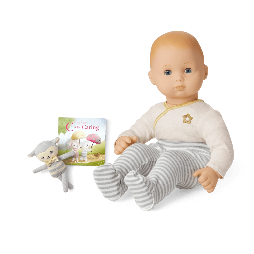 This set also features Bitty’s™ Lamb Friend & C Is for Caring Board Book: A 6-inch knitted yarn plush lamb that has a satin bow necktie and embroidered details. Comes with a board book filled with charming illustrations that teaches little ones how to be caring and kind from A to Z!