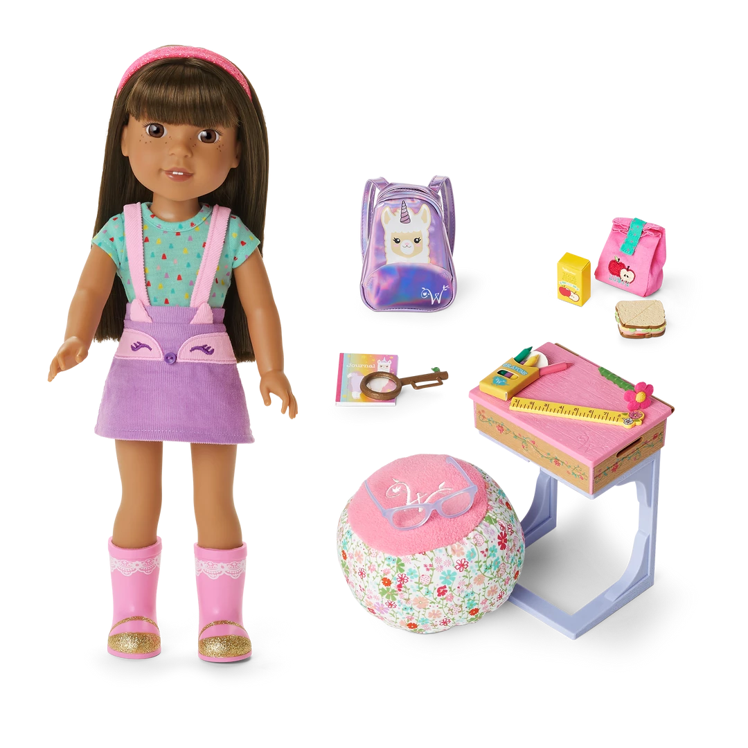 Everything your girl needs to play school with her WellieWishers™ doll! This set features the 14.5″ Ashlyn™ doll dressed in the Smart as a Fox School Outfit and her signature wellie boots. It includes a desk with a floral cushion seat, a sack lunch, a llamacorn backpack, and school supplies.