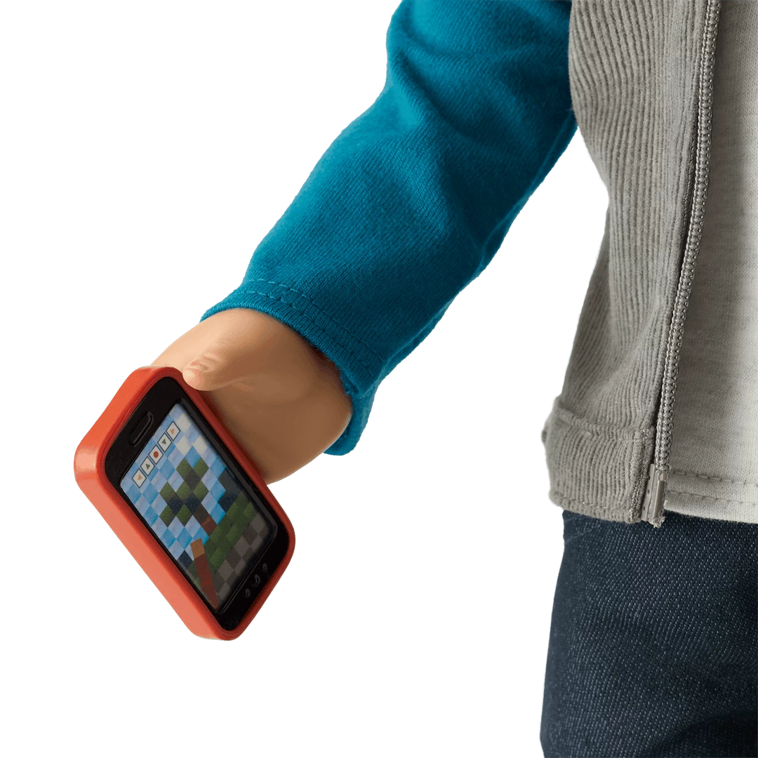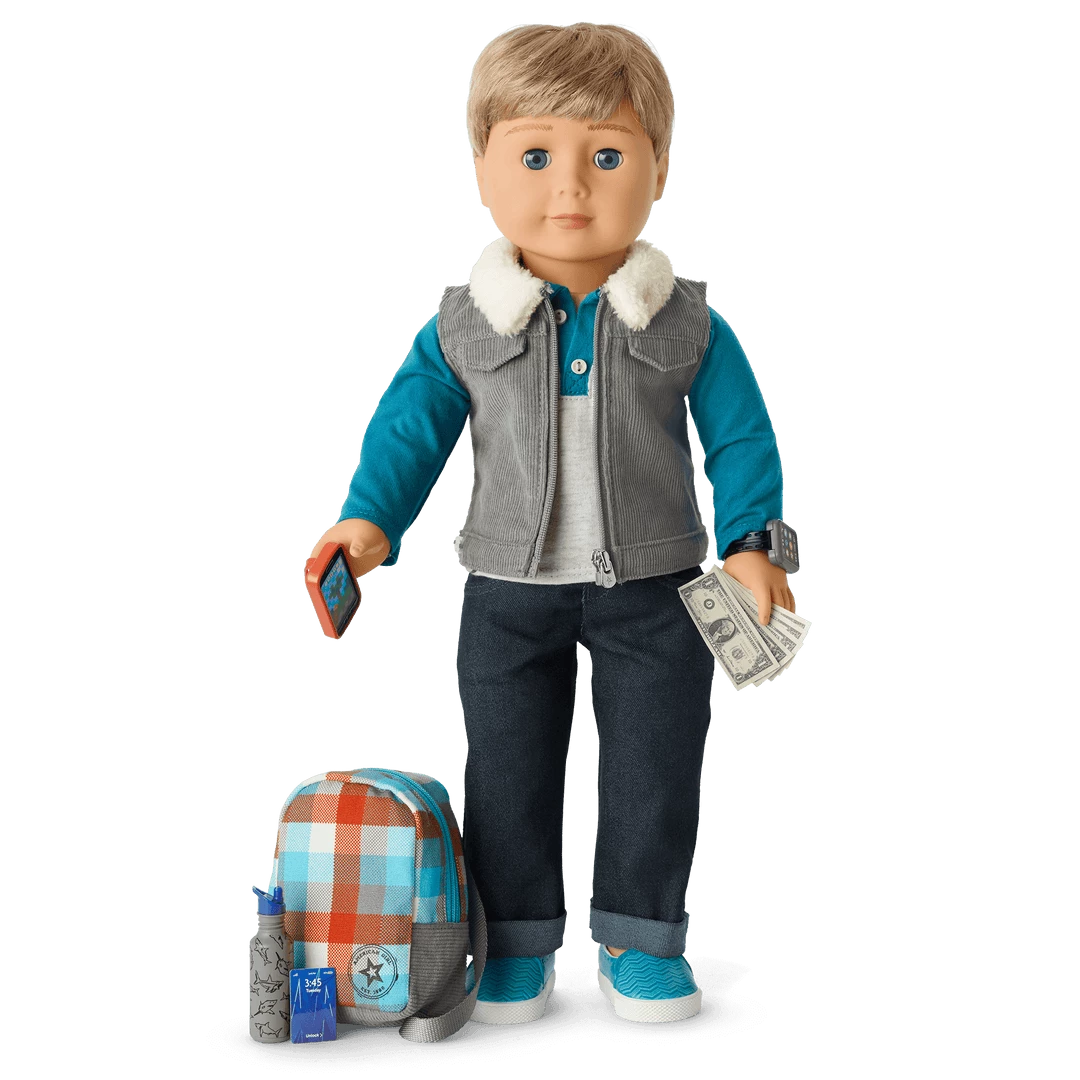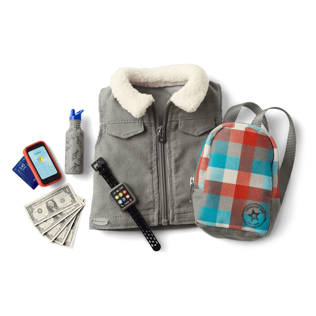 - A plaid backpack with an AG graphic that zips open and fits on the doll’s shoulders