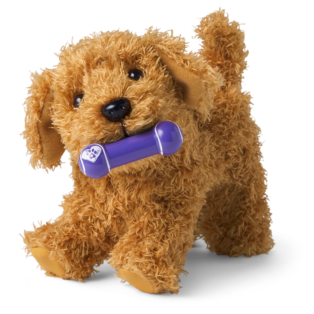 Daffodil Doodle™ Dog for 18-inch Dolls: This posable Labradoodle dog has short, curly golden-brown fur, brown eyes, and a magnetic mouth to hold her barbell toy