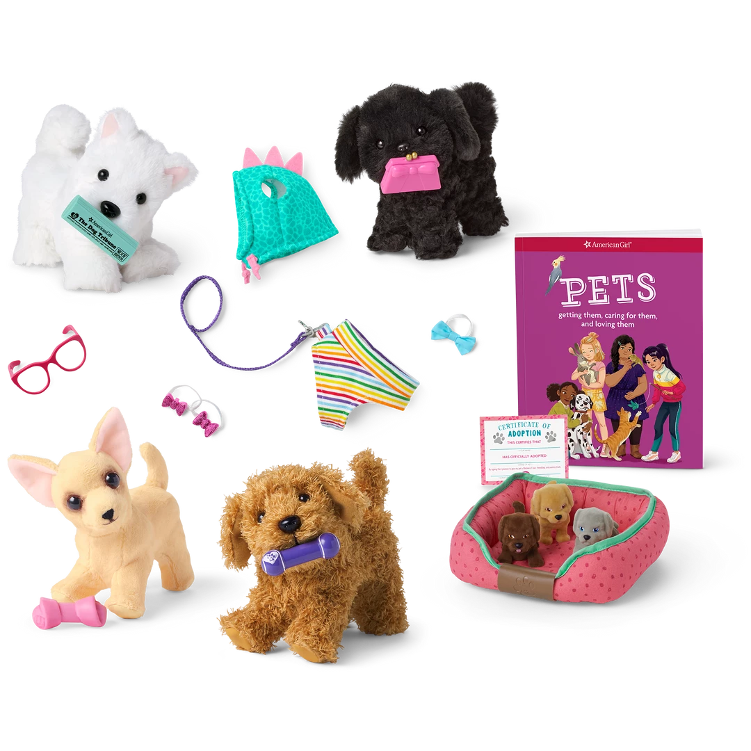 All the Puppies Set: A brown puppy in a play pose, a golden puppy in a standing pose, and a gray puppy in a lying down pose—all with soft touch flocking and a hidden magnet so any of the American Girl® pets can pick them up. Also includes a pink stuffed bed with and an embossed faux-leather cuff on the front that fits all three puppies and any American Girl® doll-sized posable pet, plus a pet adoption certificate.