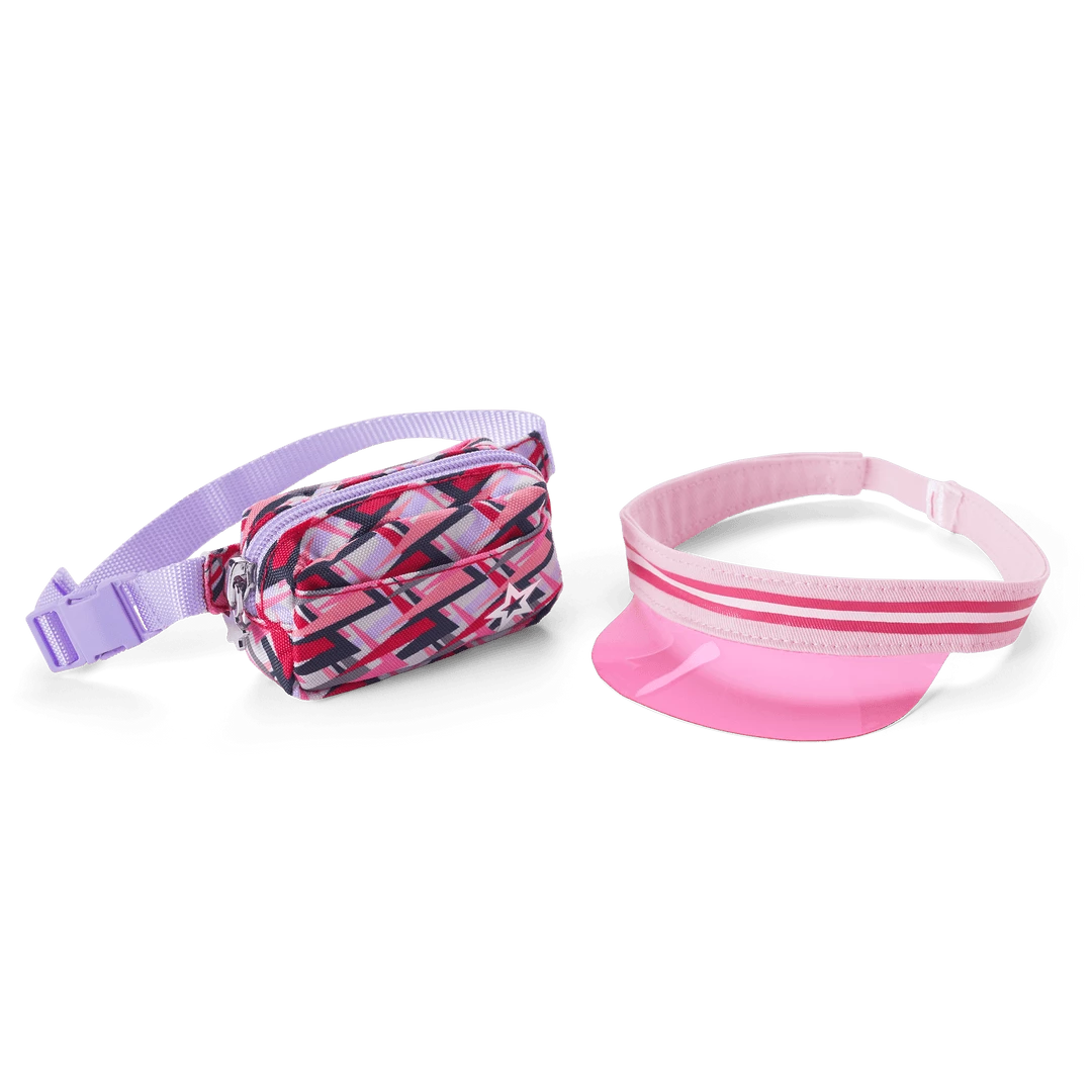 A zip-top geometric-print belt bag that fastens around the waist, and a transparent pink visor with a striped twill band to shield the sun.