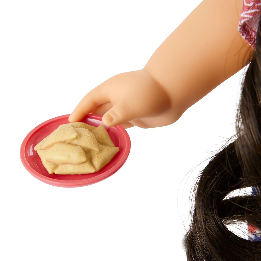 - Traditional almond pastry called almond briouat that is made with almonds and honey and topped with sesame seeds—it comes on a plate the doll can hold