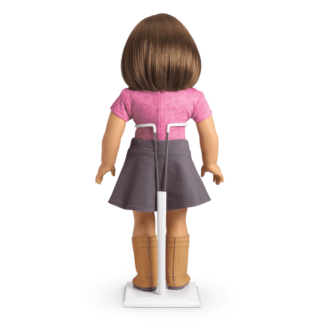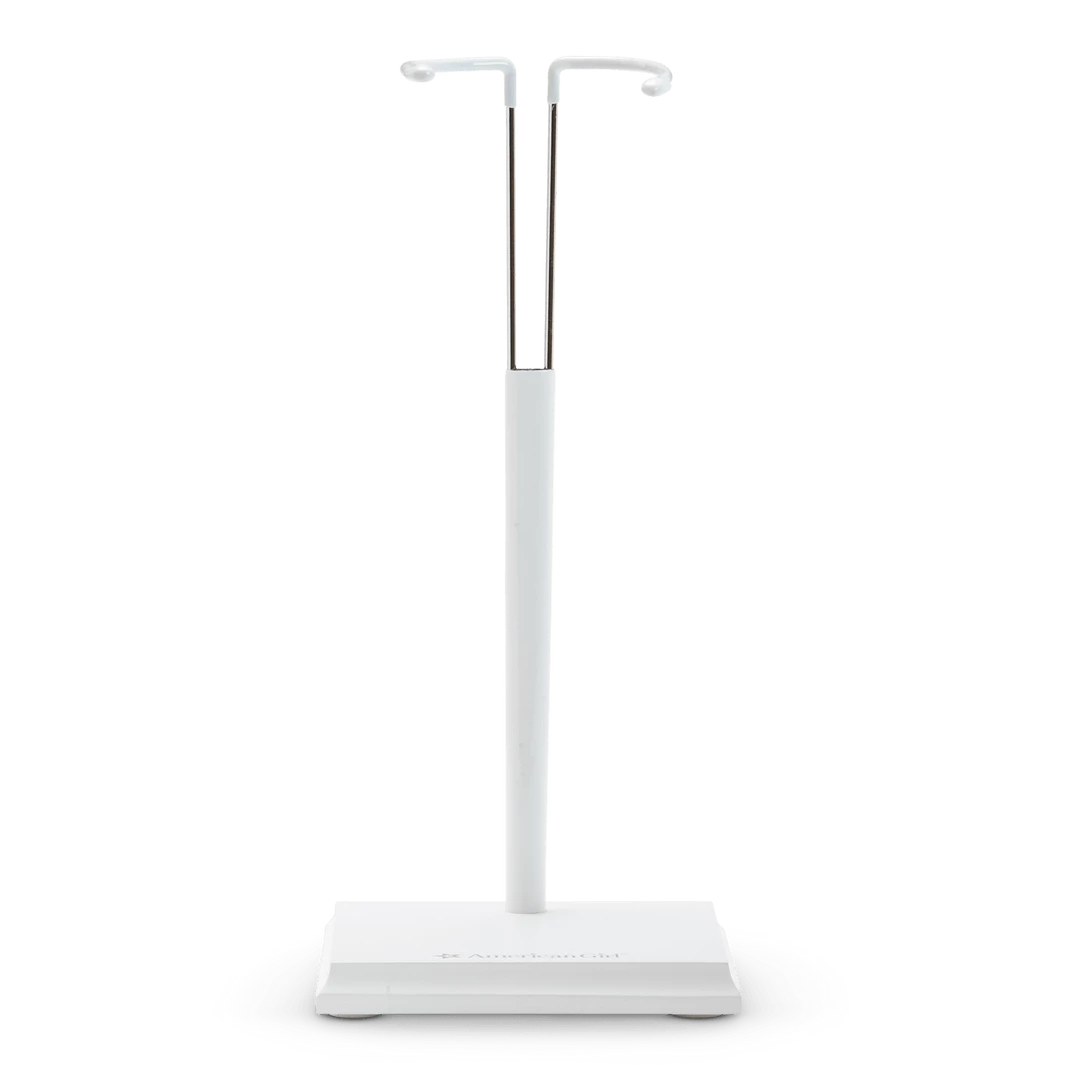 This doll stand makes it easier to play with and display an 18″ doll. It has a square wooden base and a metal holder that can extend to 11″ tall.