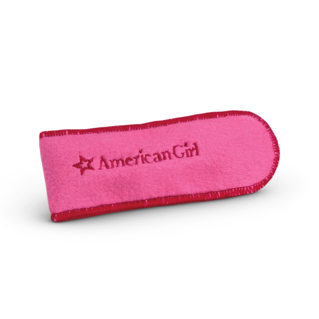 These rectangular doll glasses have raspberry-colored frames. Made to fit 18″ dolls. Includes an embroidered case for safekeeping.