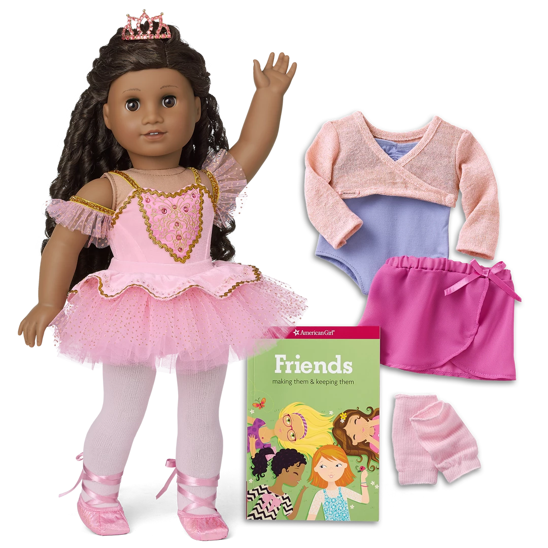 The perfect friend for girls who love to dance and twirl, this 18″ Truly Me doll has curly black-brown hair, brown eyes, and dark skin, and arrives dressed in a sparkly leotard with golden edging, a ruffly tutu, underwear, tights, and ballet shoes with crisscross ribbons. Also includes a pretty pink tiara, wrap skirt, warm-up leotard, sparkly sweater, and legwarmers, plus the Friends: Making Them & Keeping Them book.