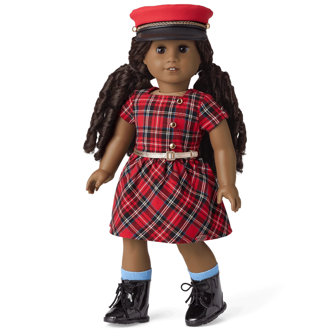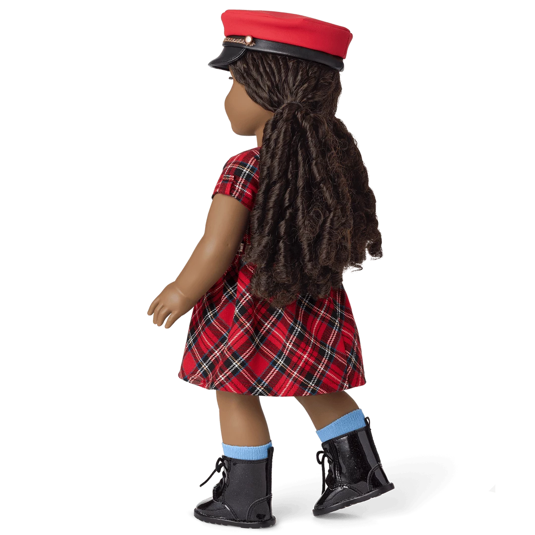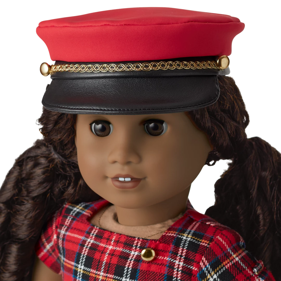 - A red fisherman-style cap with a navy brim and gold trim to wear while out strolling