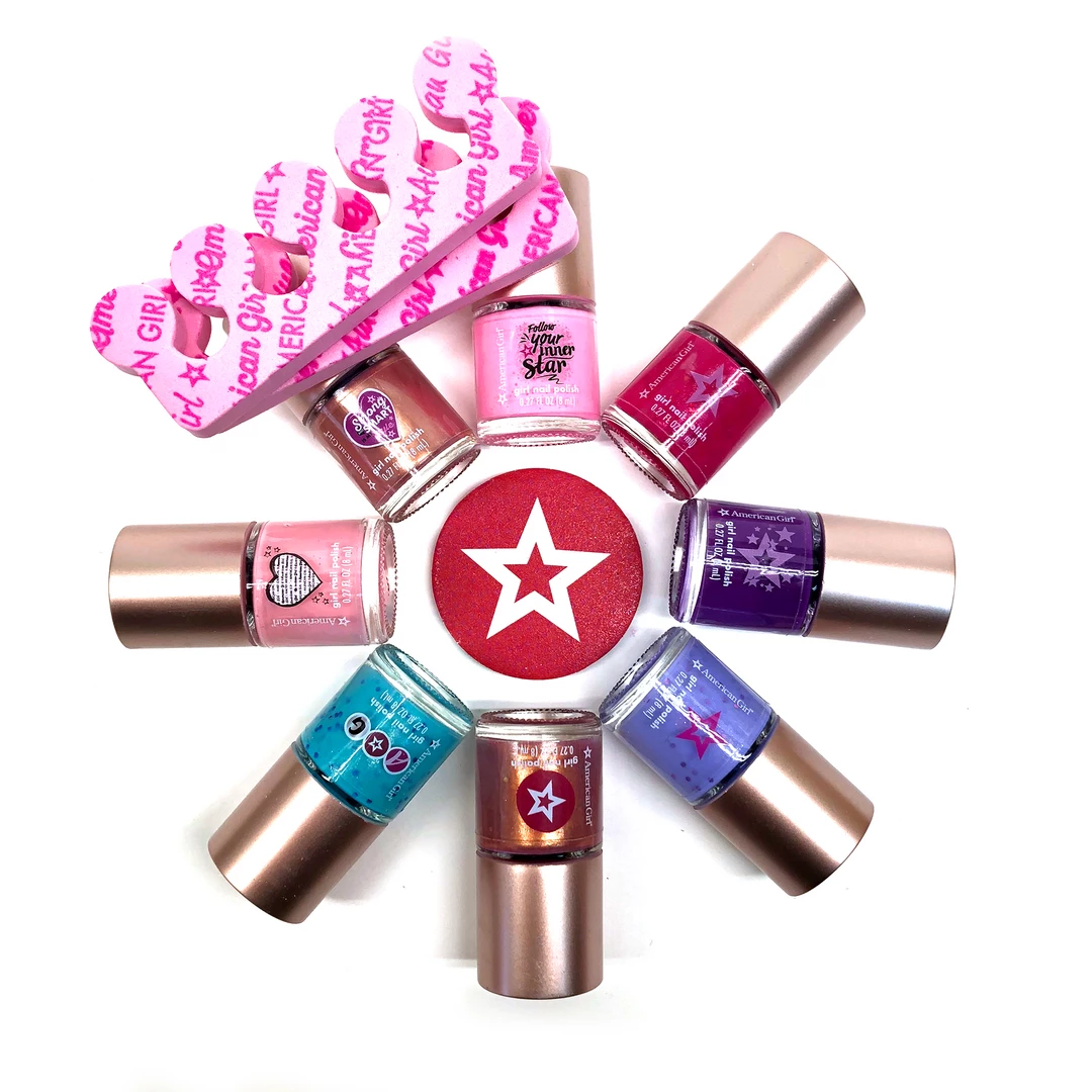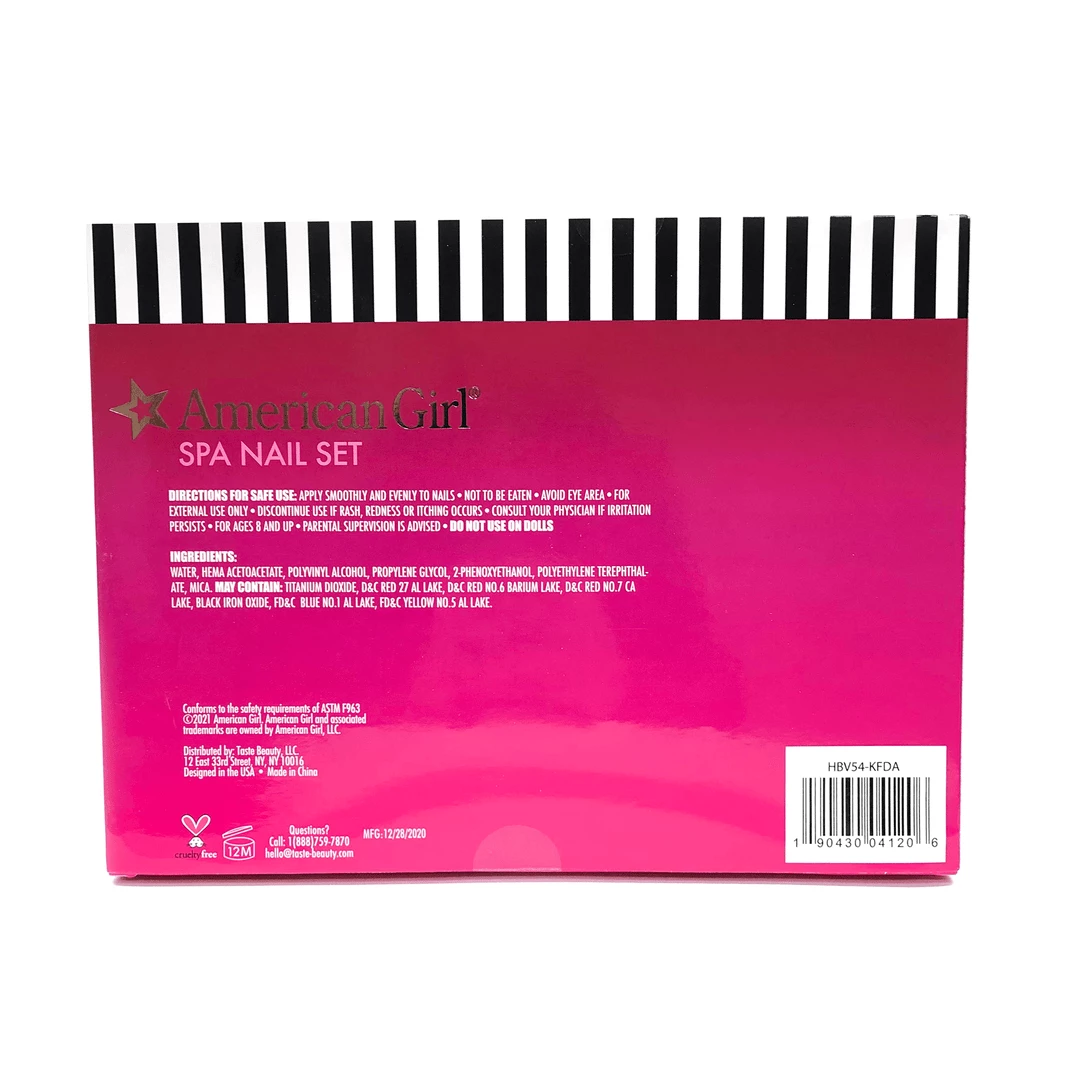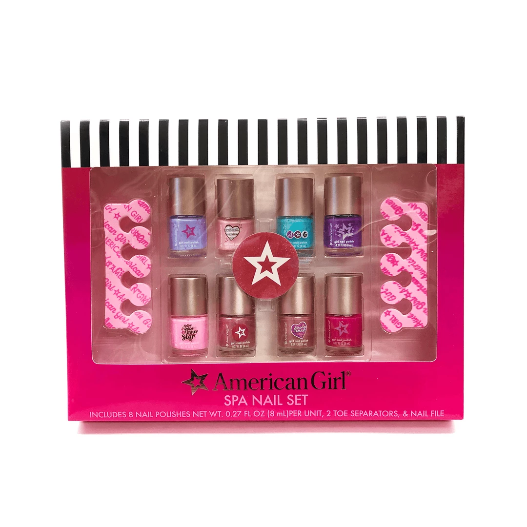 American GirlÂŽ Spa Nail Set for Girls: This water-based nail polish set is certified cruelty-free and never tested on animals. It includes two toe separators and a nail file, along with eight polish colors. Not for use on dolls.