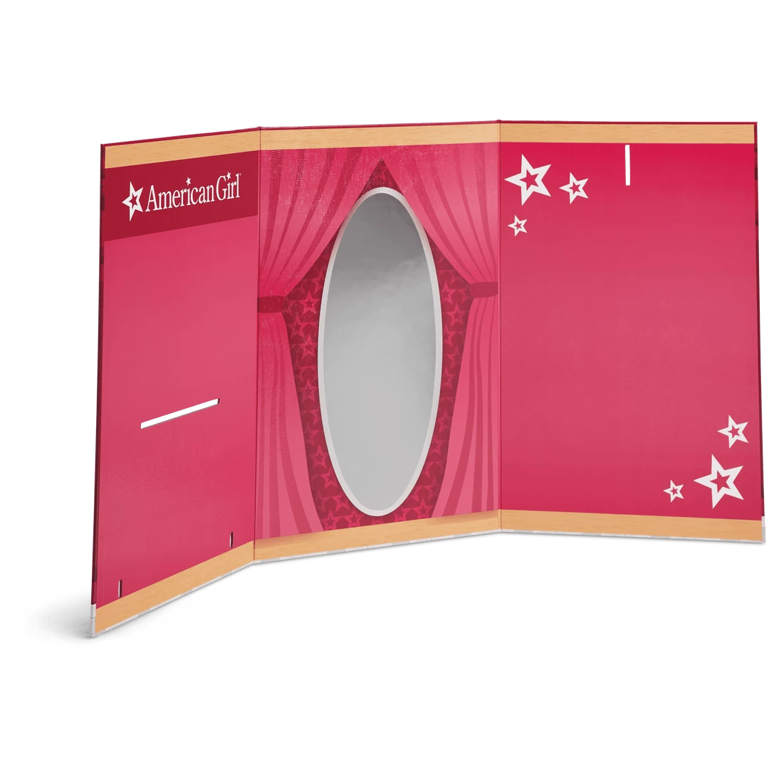 She can set up shop with this cute two-sided scene as backdrop! It includes a fold-up dressing room with a mirror, a clothing rack to hang outfits on, and a display shelf.