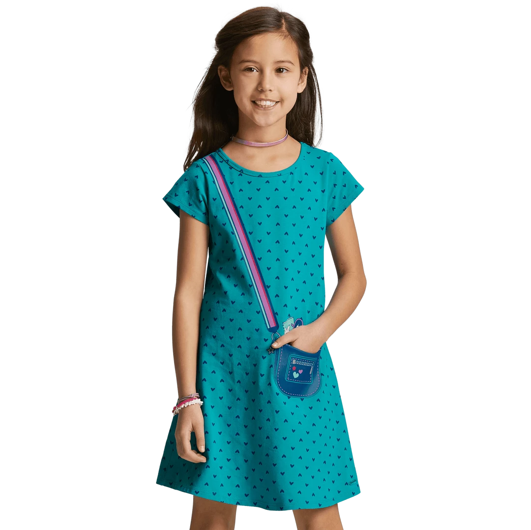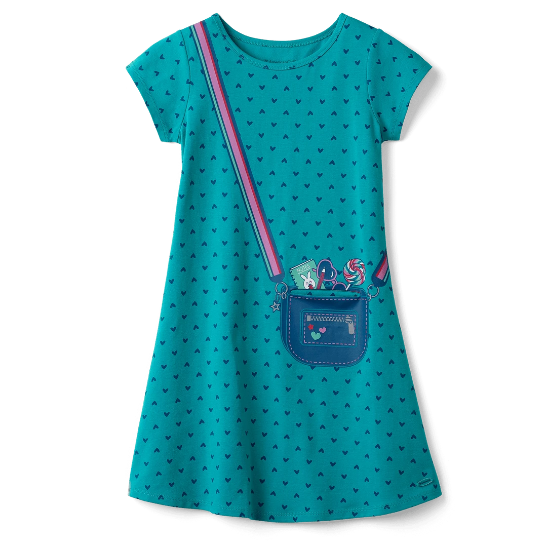The trompe l’oeil graphic on this short-sleeved knit dress makes it look like your girl is carrying a purse—and it’s also a pocket. So fun—plus it matches the doll dress! Cotton/spandex. Imported. Teal. Sizes XS-XL