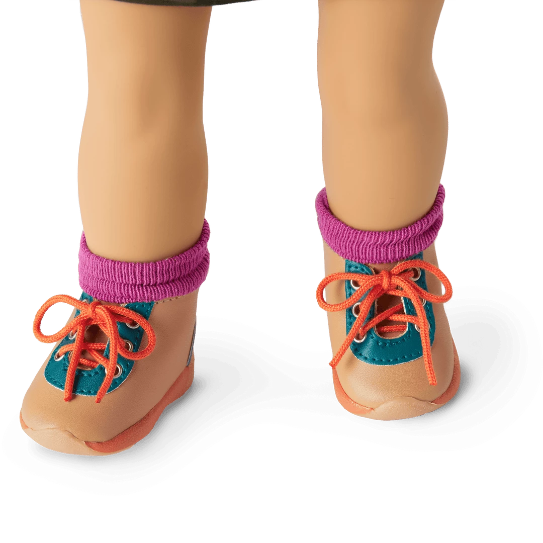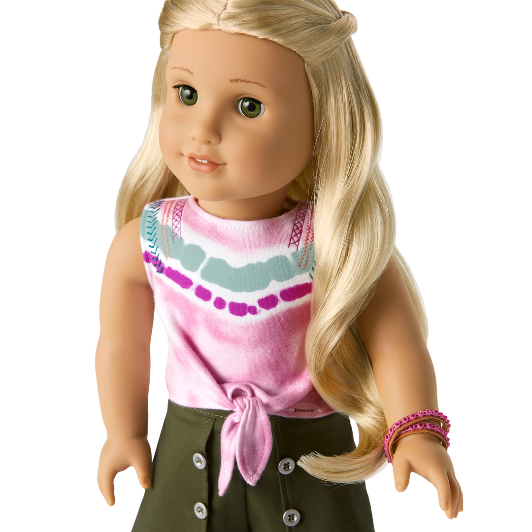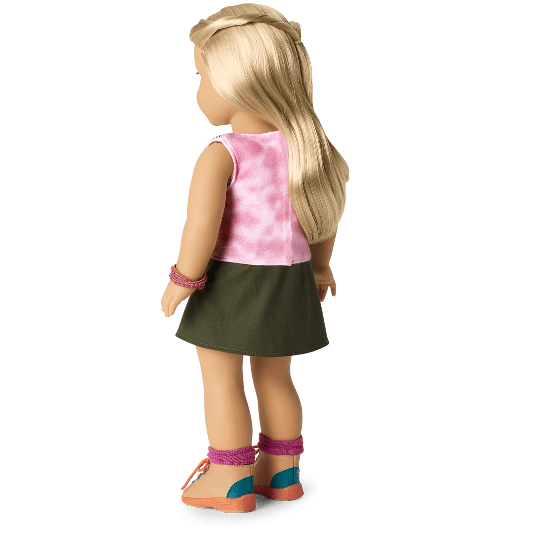 - The 18“ Kira doll has green eyes and long, wavy blond hair that can be brushed and styled. It comes styled in a half-up twist with long loose curls.