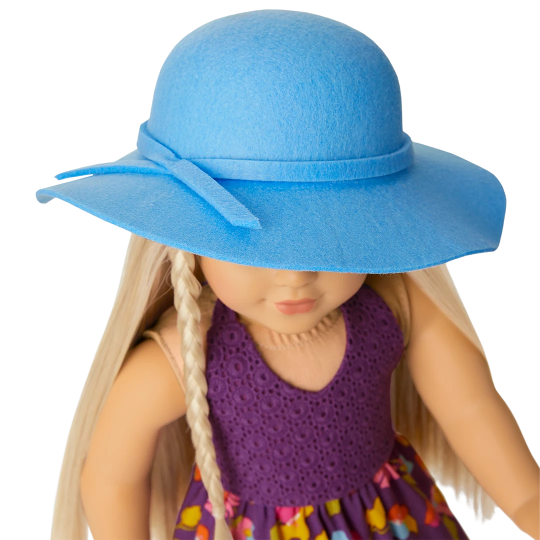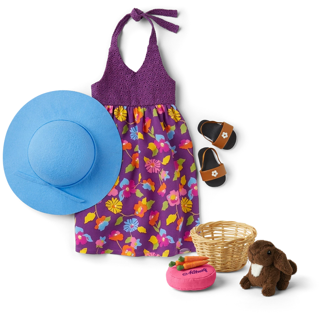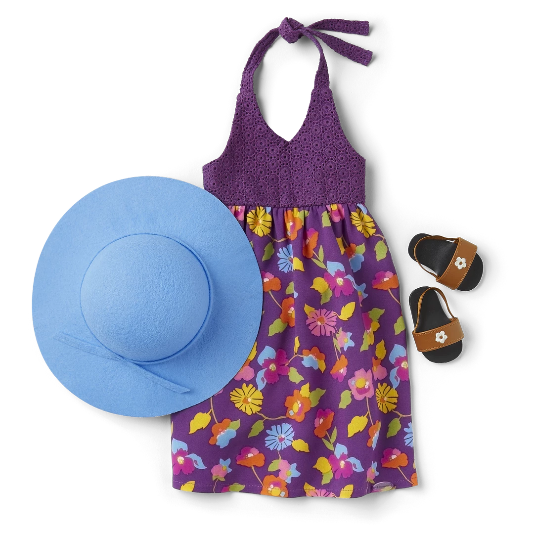 Julie’s™ Birthday Outfit for 18-inch Dolls: A dress with a crocheted top and floral maxi skirt, a felt hat, and sandals with embroidered flowers