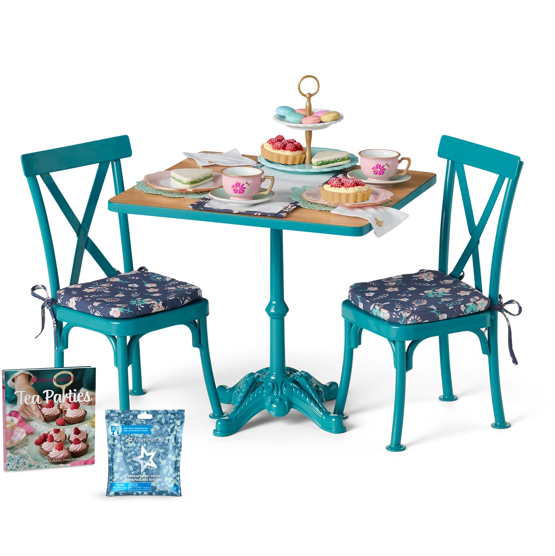 Teatime Table & Chairs Set: A painted metal table and two painted metal chairs with cushions, a table runner, a tiered platter, and two each of placemats, plastic dishes, napkins, and teatime treats.