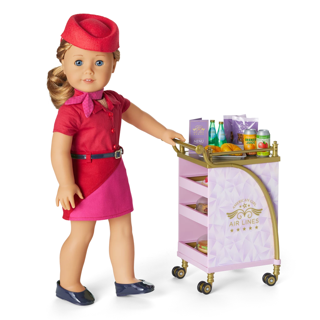 When dinnertime or snack time roll around, so does this fancy food cart that helps the flight attendant easily move everything down the aisle of the American Girl Air Lines plane. It includes: