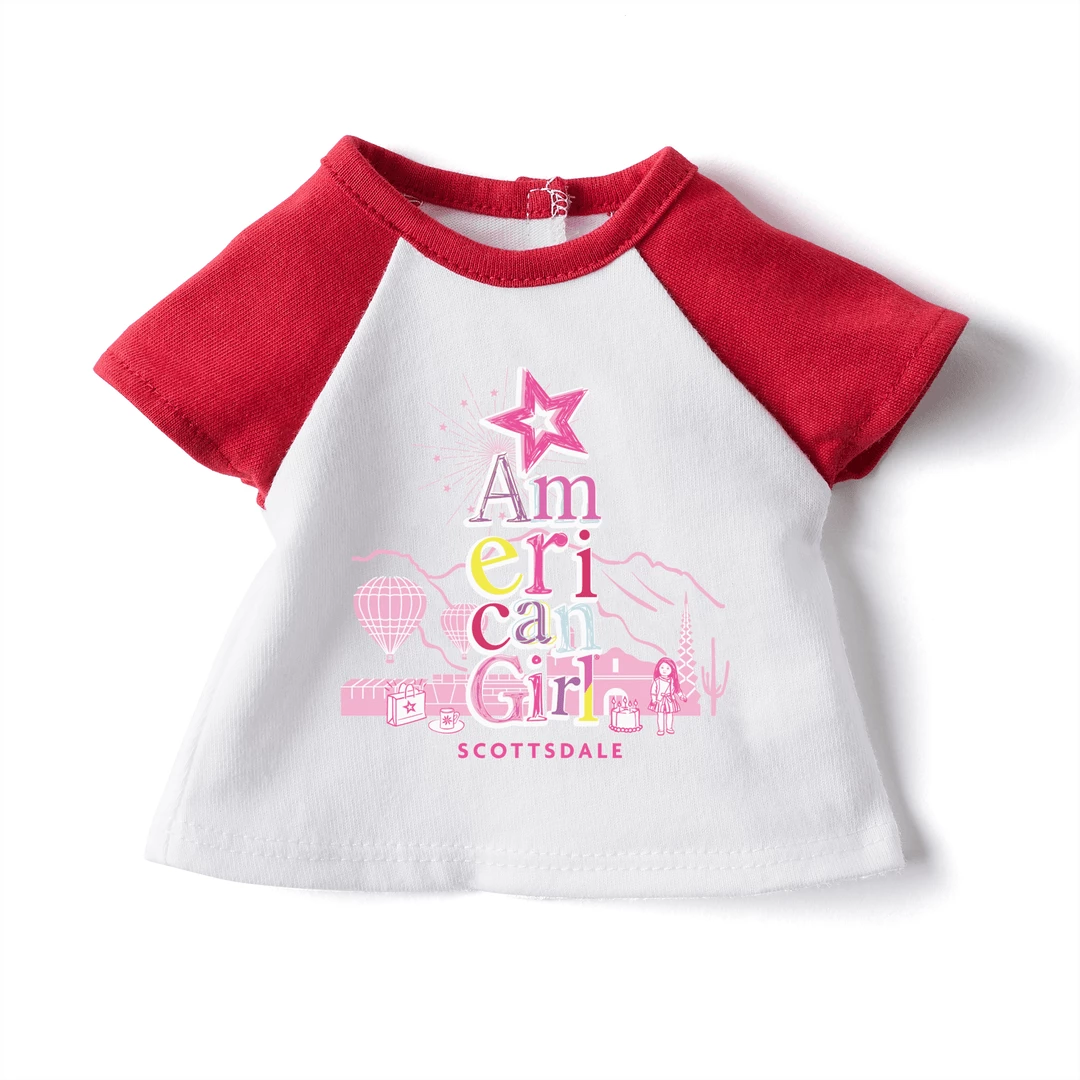 Her doll can show her American Girl city spirit with this tee! It features red raglan sleeves and an American Girl Scottsdale store design.