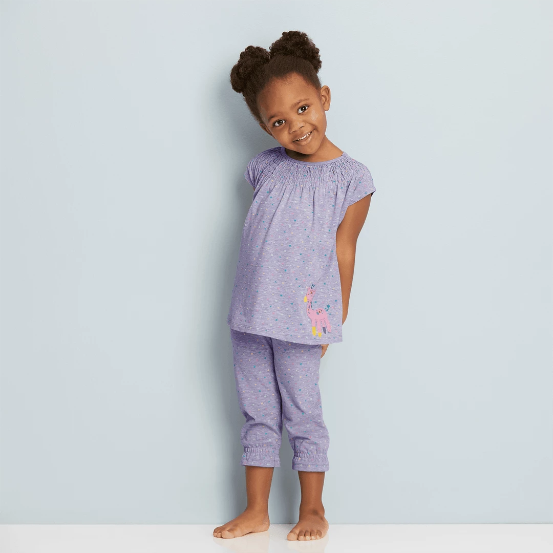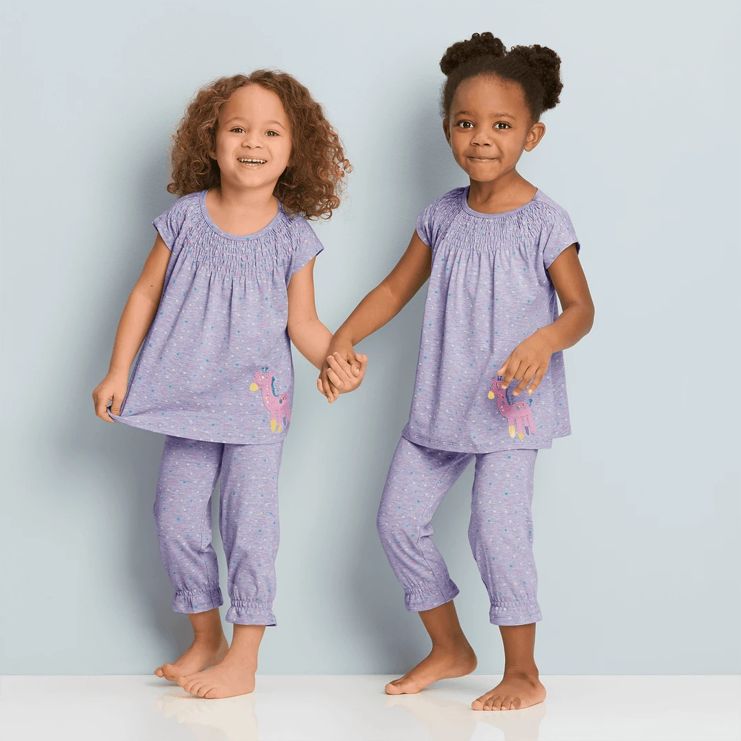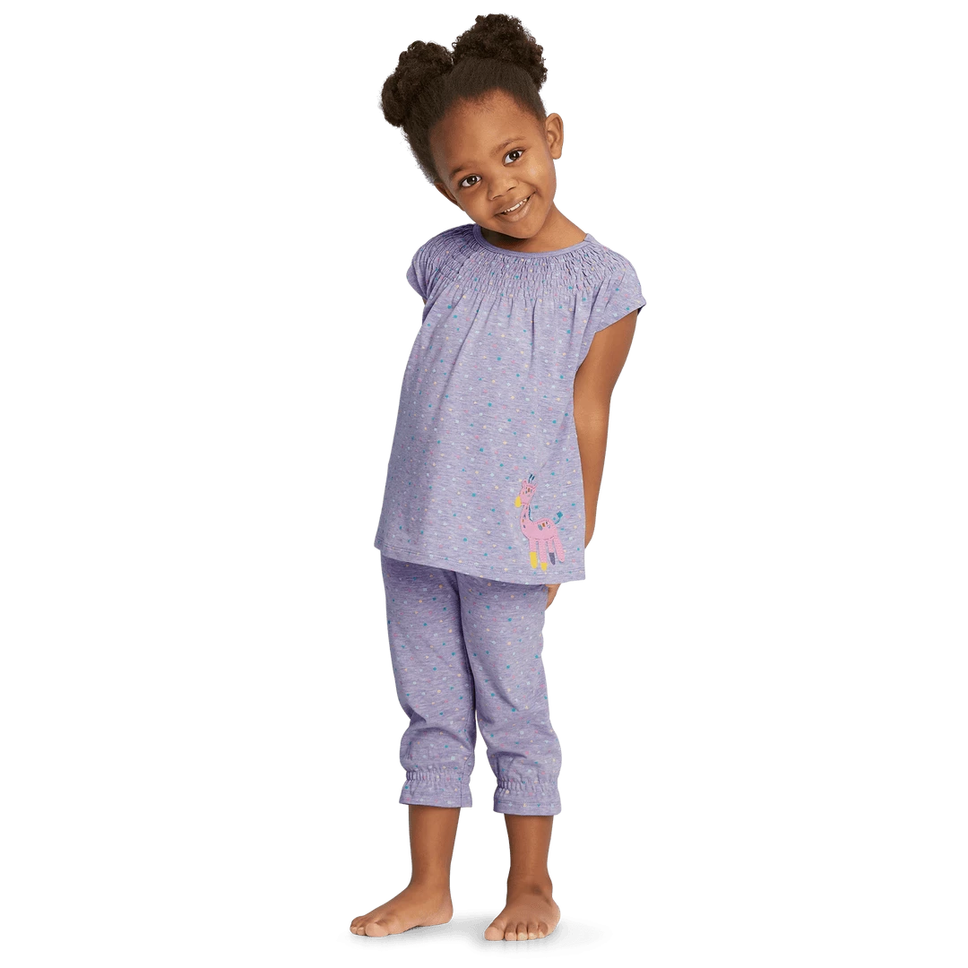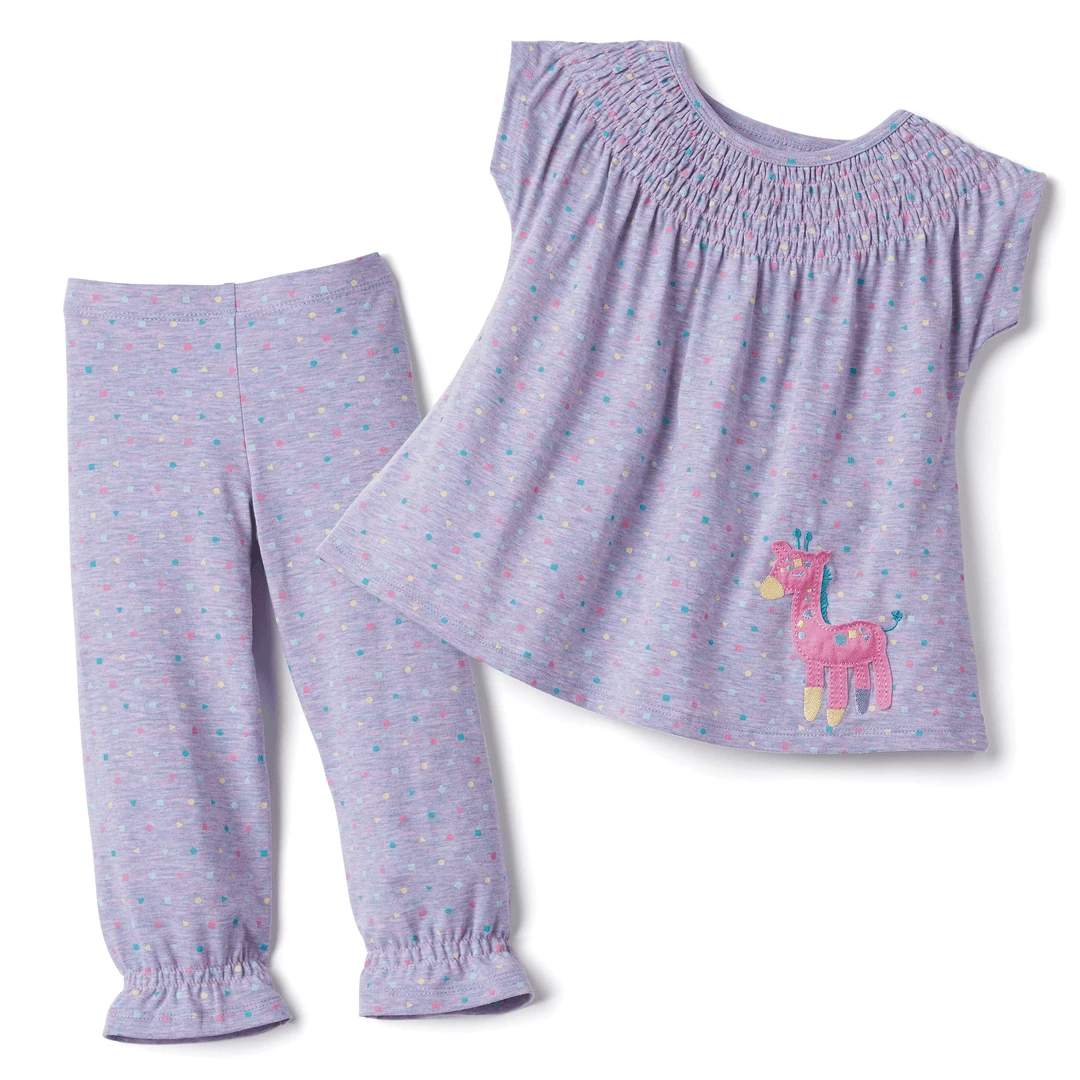 Your girl can match her Bitty Baby⢠doll at bedtime! The periwinkle polka-dot top has a smocked neckline and a sleepy giraffe applique, and matching knit pants with elasticized ruffle hems. Flame-resistant polyester. Imported. Periwinkle. Sizes 3-6