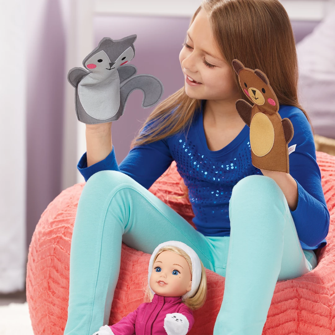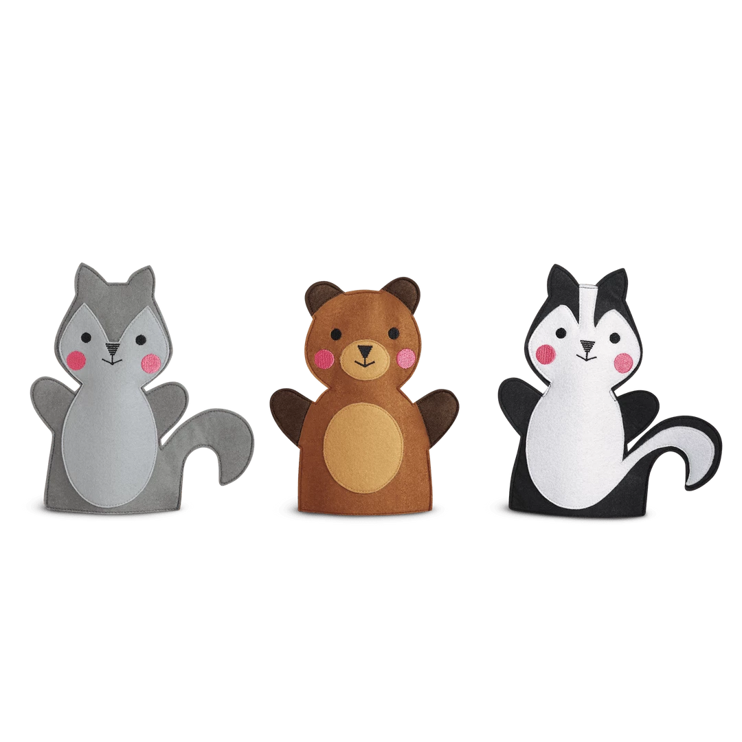 The WellieWishers love to act out stories in puppet shows, and your girl can, too, with these three frisky friends that will fit on her hand. The bear, squirrel, and skunk are made of layered felt with embroidery details.