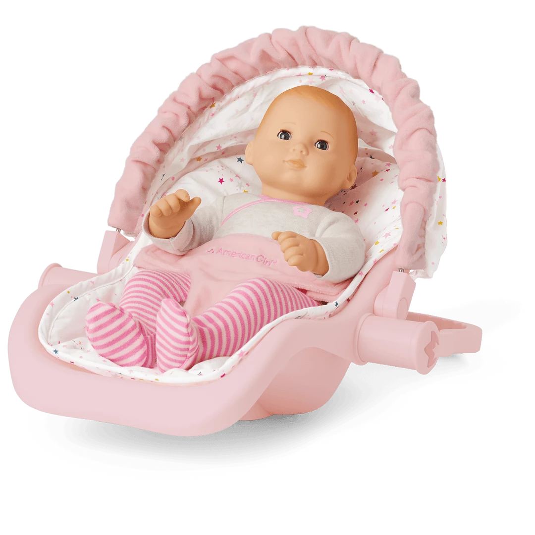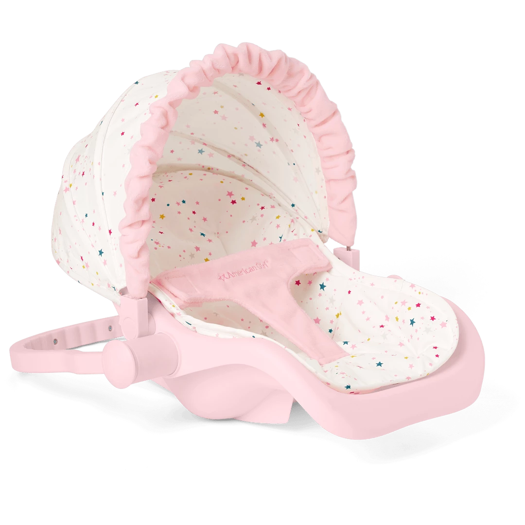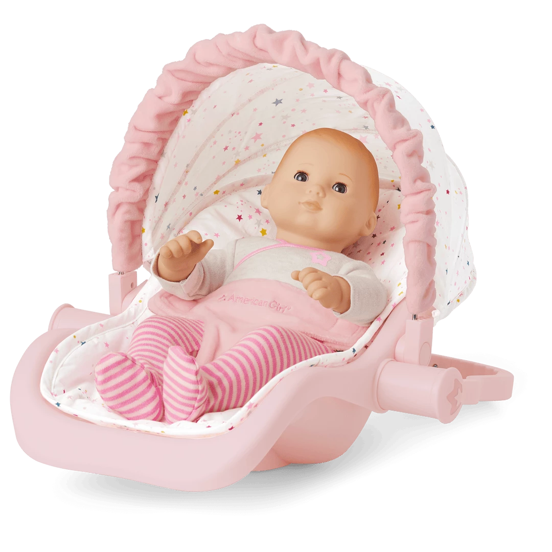 This doll-sized travel seat has a star-print fabric interior with a soft plush lap strap to keep Bitty Baby secure, and a fold-down visor to keep the sun out. The handle can move up or down for easy carrying.