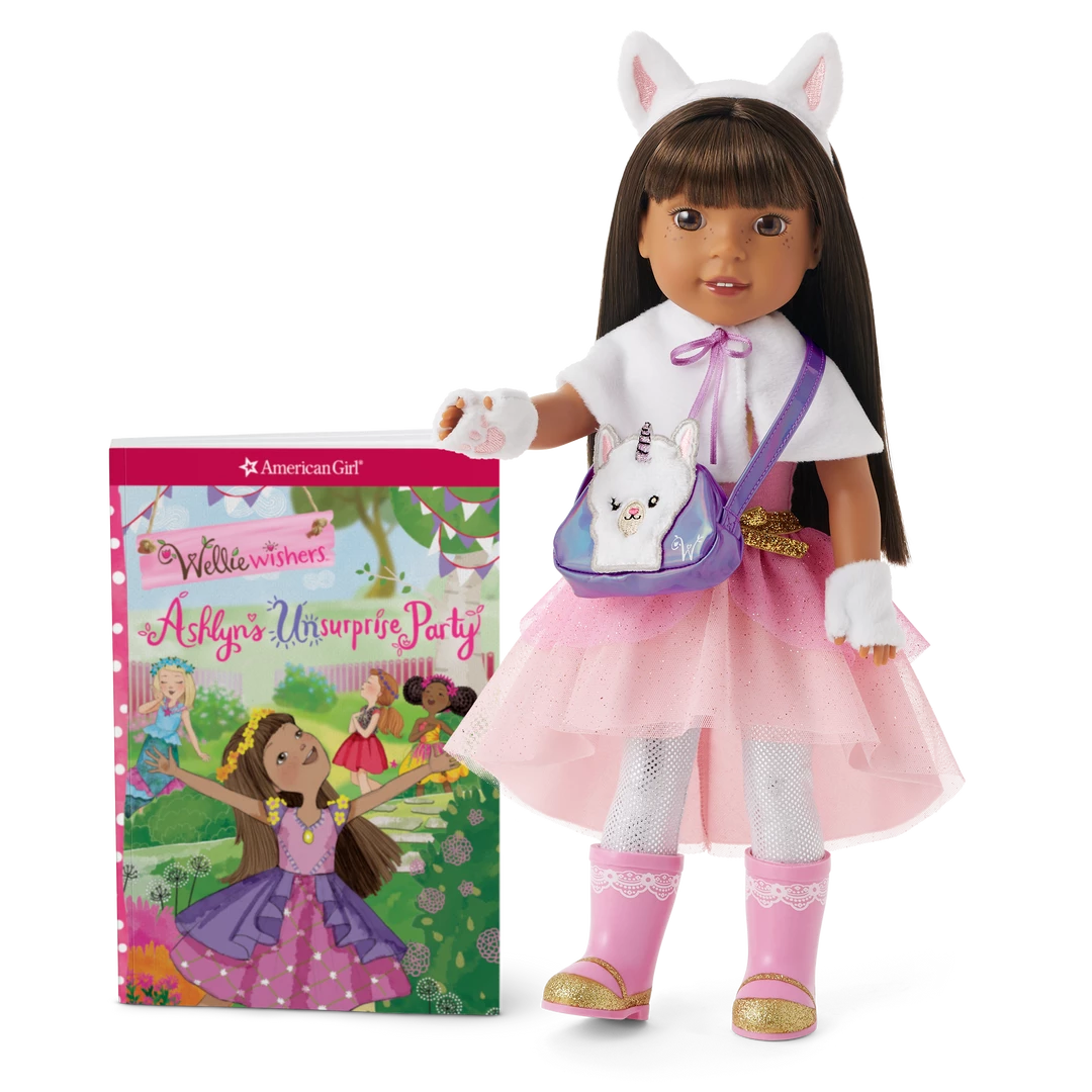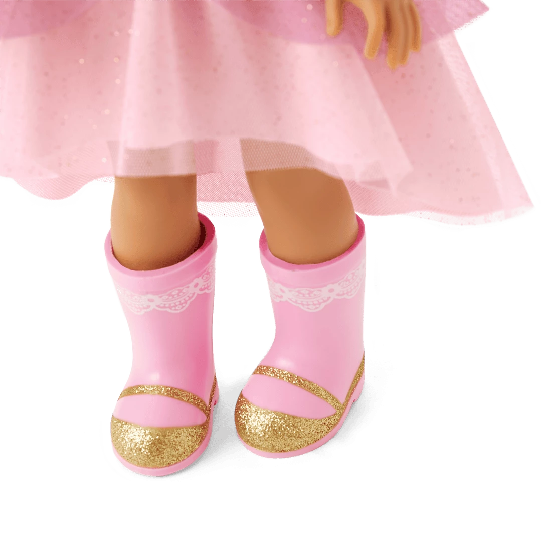 Ashlyn™ Doll: The 14.5″ Ashlyn doll, featuring brown eyes and silky brown hair, dressed in her princess outfit and wellie boots