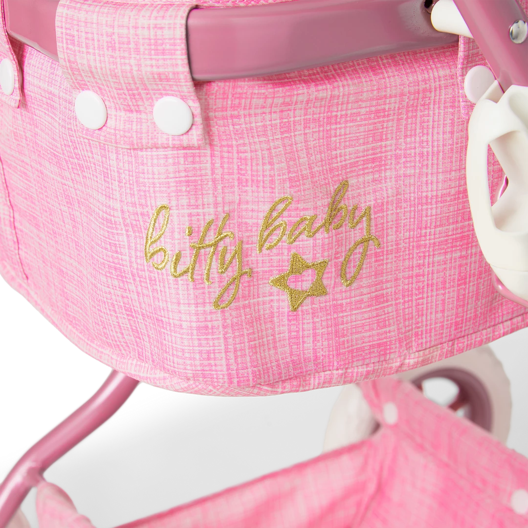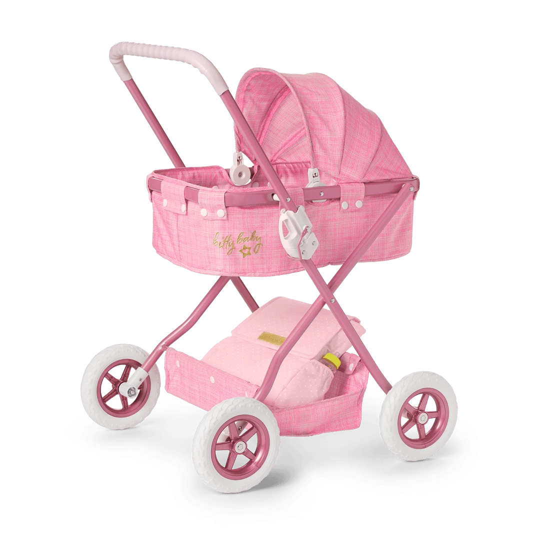 It’s time to take Bitty Baby on a walk in this stroller that’s big enough for two—perfect for one Baby or two! It has a pink metallic frame that holds a pink printed bassinet lined with plush fabric for a soft and sweet landing place. Open and close the canopy for a bit of sun or shade, and store all of Baby’s necessities in the caddy underneath. The stroller folds flat for storage.