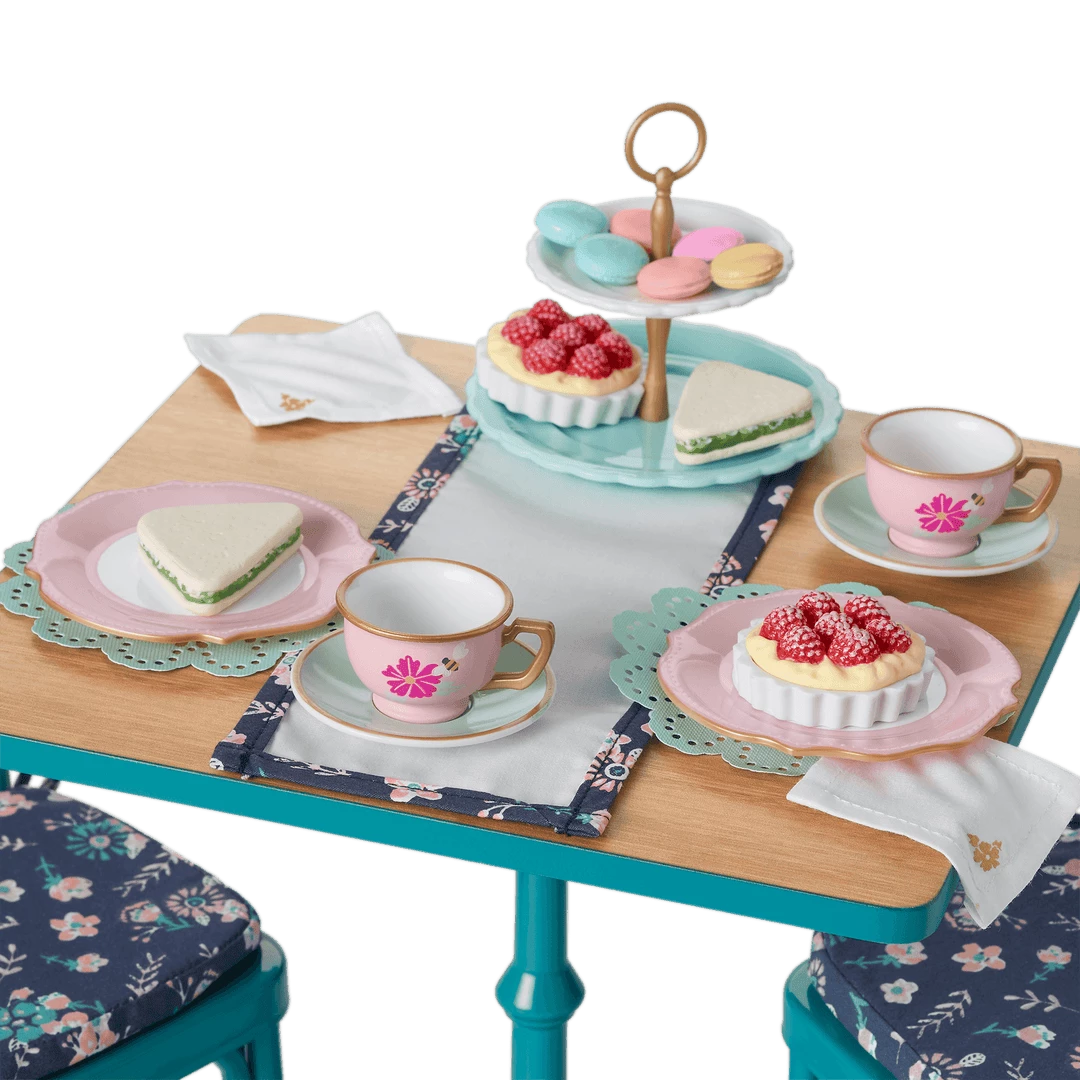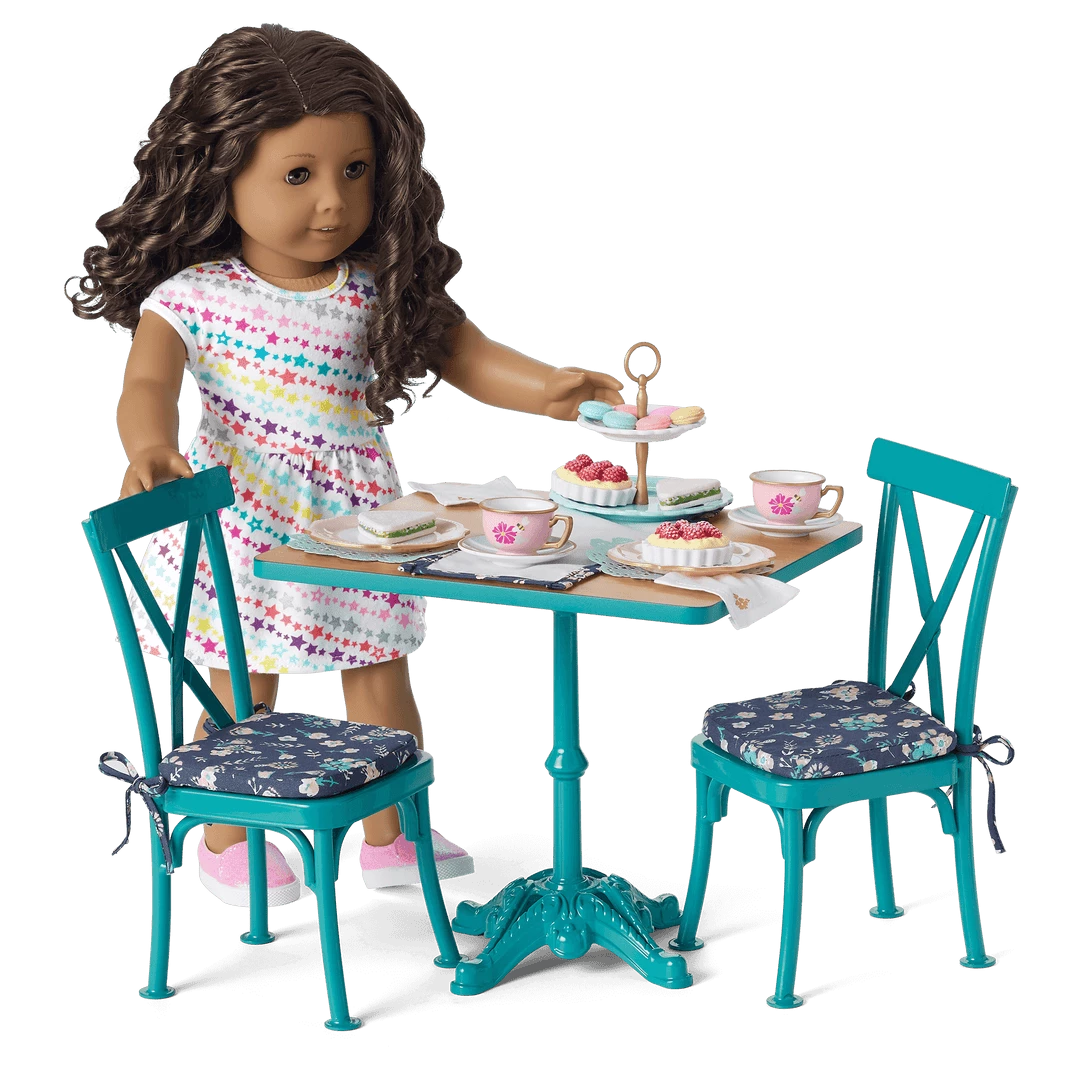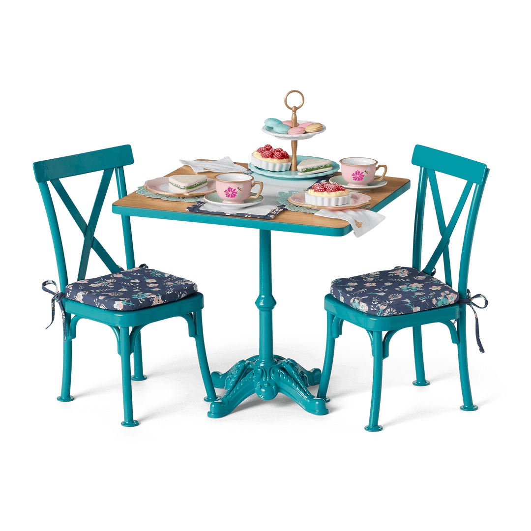 - A painted metal table where dolls can enjoy a dinner or tea party