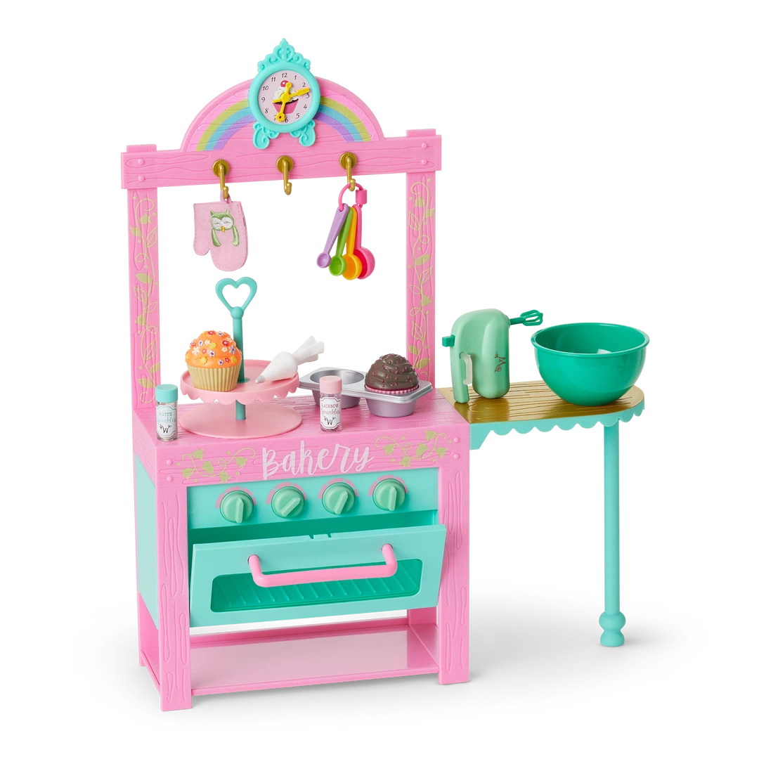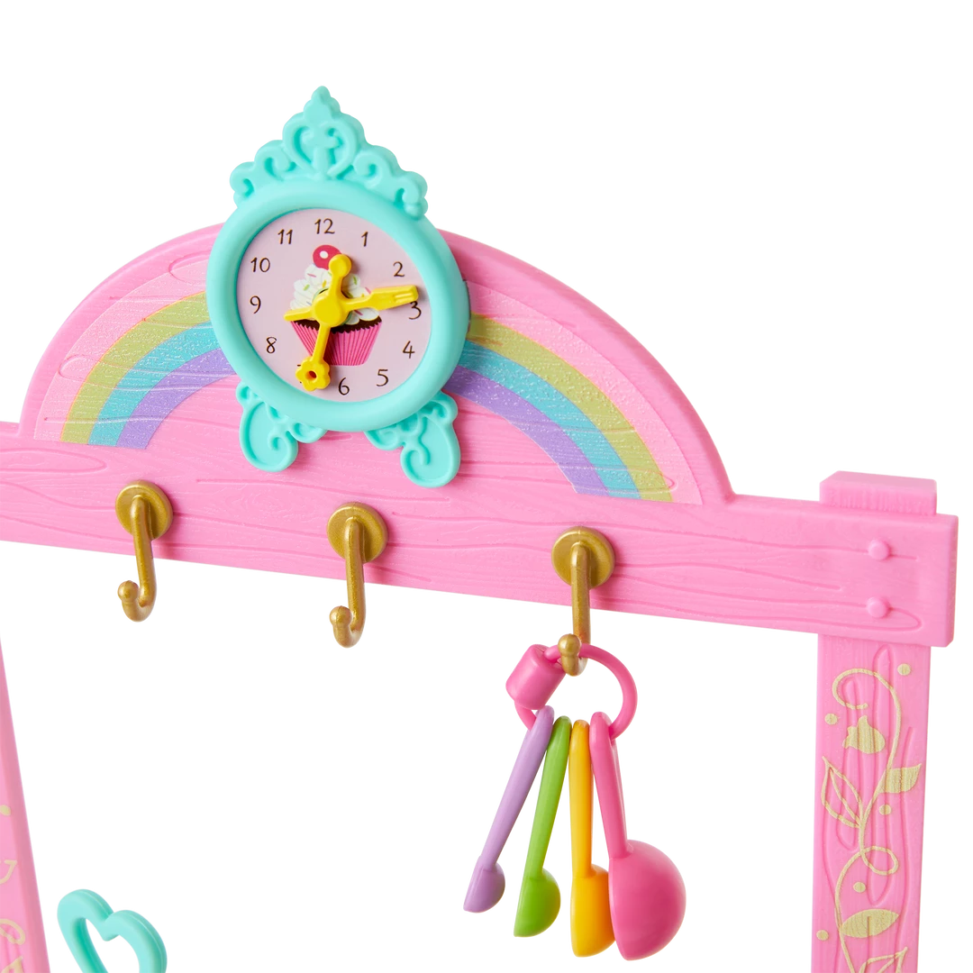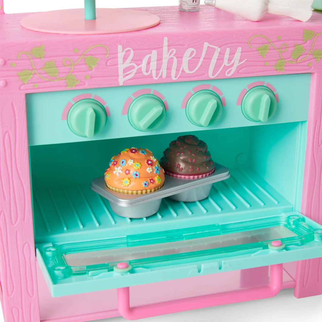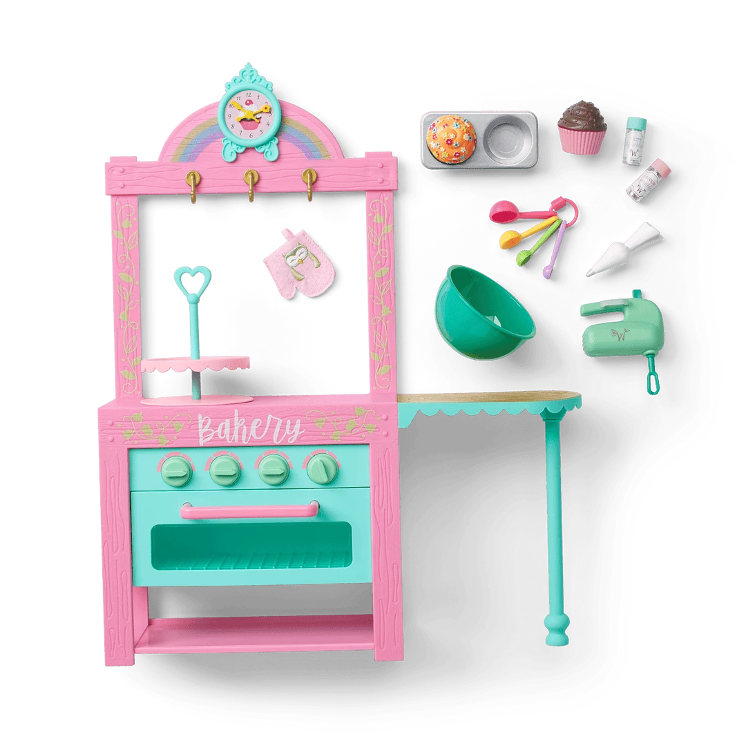 - A pink kitchen with an oven that opens and closes, working knobs, a countertop for prepping treats, storage for all sorts of baking equipment, and a clock with movable hands