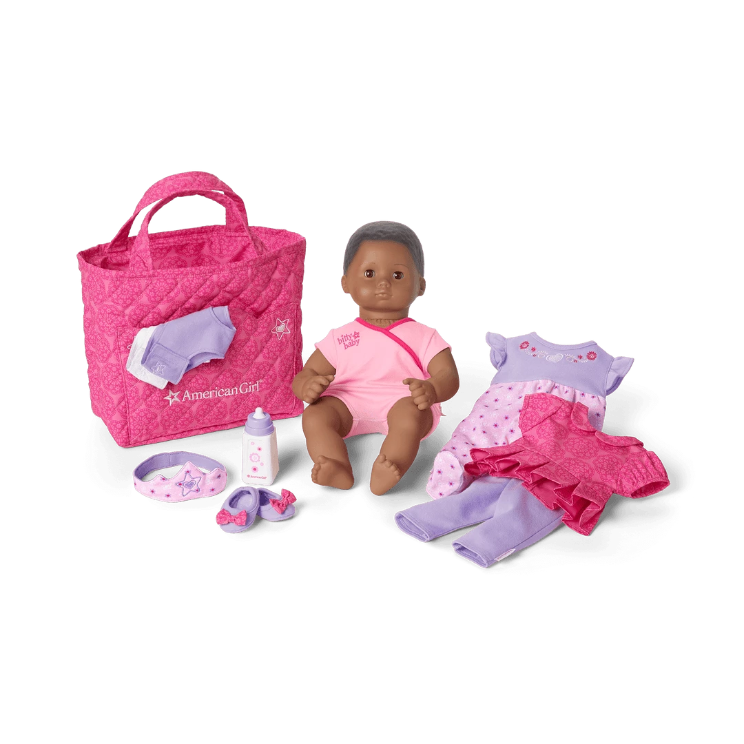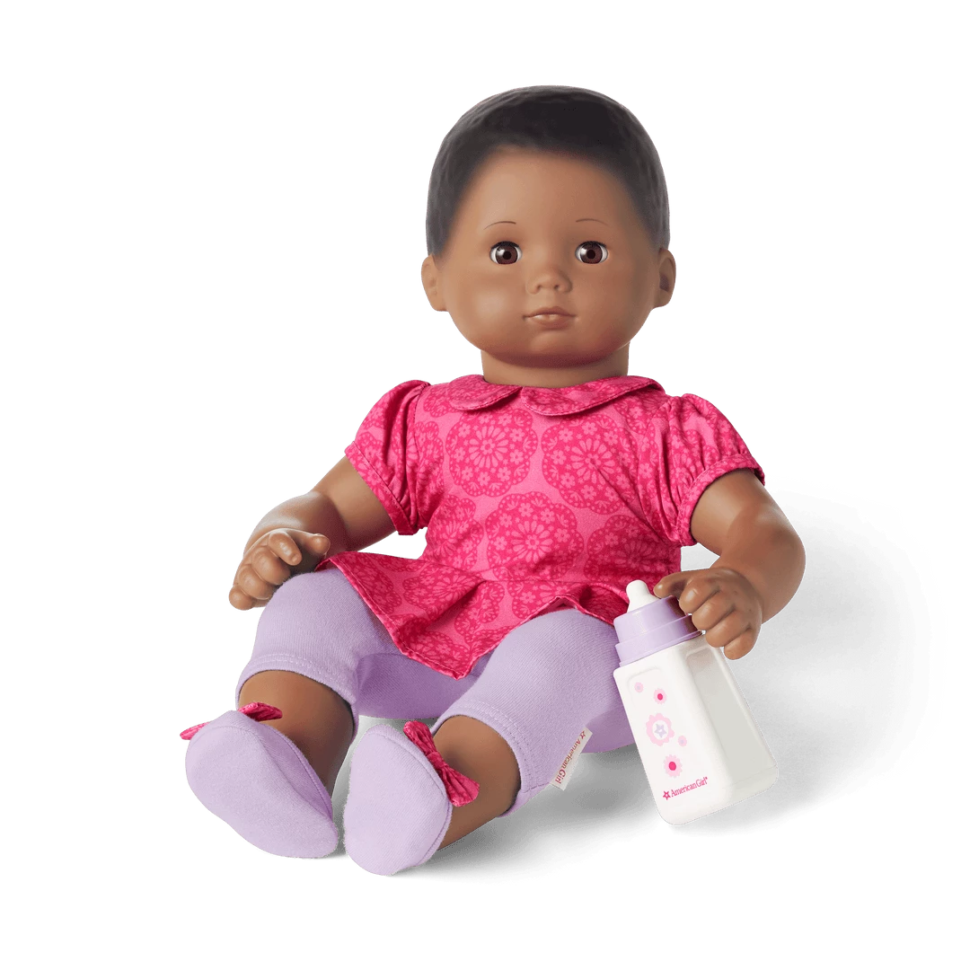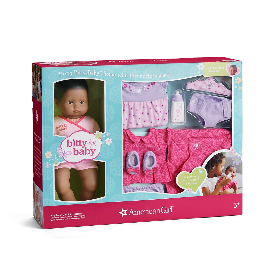 Brown Eyes, Textured Black Hair, Dark SkinWelcome Bitty Baby home with everything your little one needs to cuddle and care for her. The Bitty Baby doll is 15″ tall with a soft cloth body, vinyl head and limbs, and eyes that open and close. Along with the doll, this set also includes a pink bodysuit, two diapers, a sleeper, a pair of leggings, a top, a pair of purple shoes with bows on the toes, a soft crown headband, and a bottle—plus a quilted bag to carry the supplies when she’s on the go.