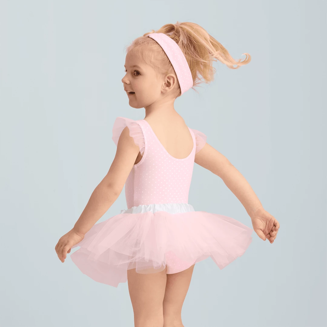 Bitty’s™ Ballerina Outfit for Little Girls: A pink leotard with a white dot print and mesh ruffle sleeves, a three-layer mesh skirt with a satin bow at the waist, and a knotted headband. Cotton/spandex/polyester. Pink. Imported. Sizes 2T-6