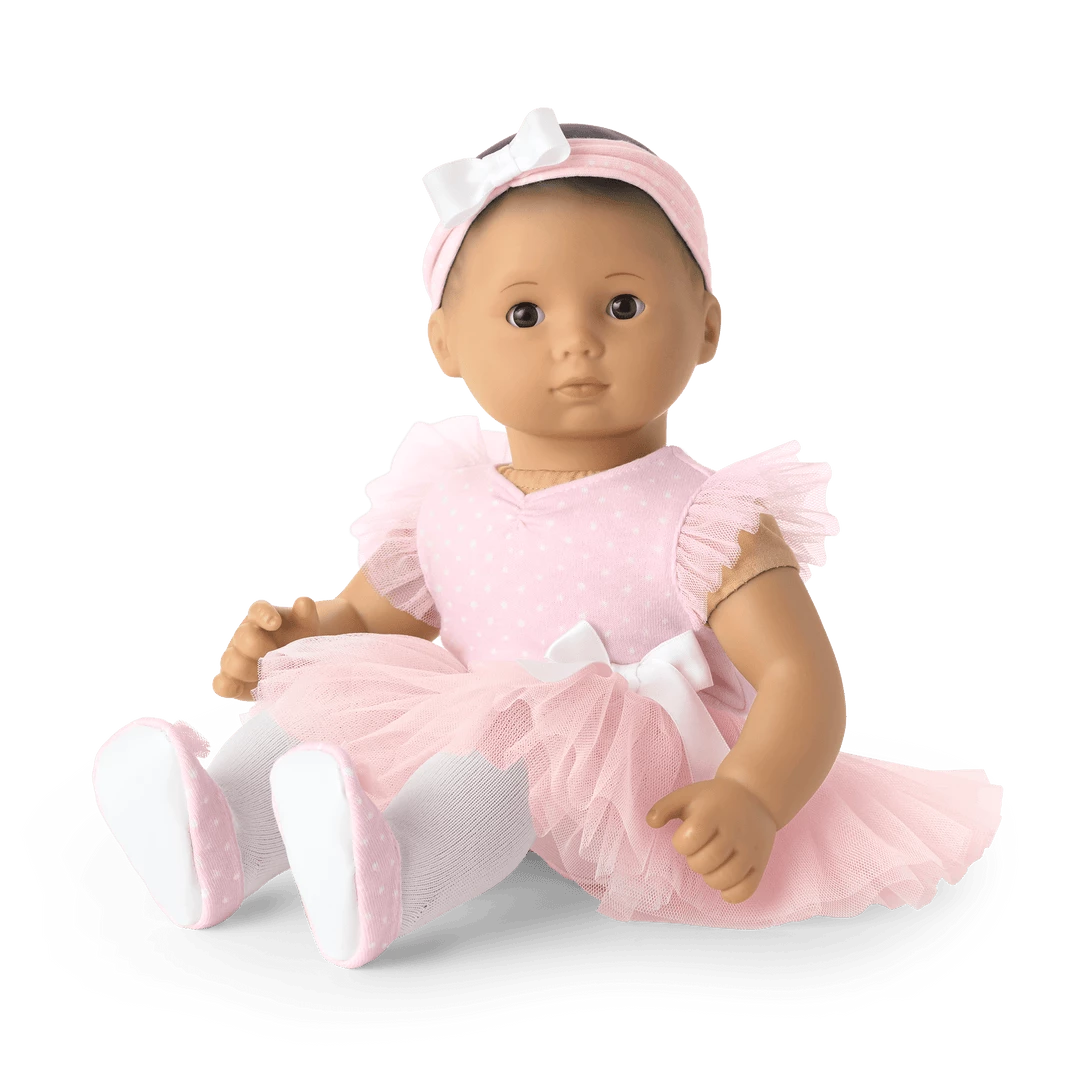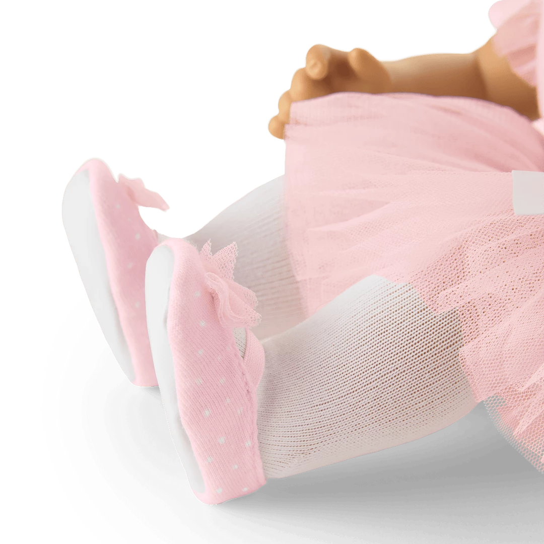 Bitty’s™ Ballerina Outfit for Bitty Baby Dolls: A pink leotard with ruffle sleeves, a mesh skirt with a white satin bow at the waist, a knotted headband, a pair of white tights, and a pair of pink ballet slippers