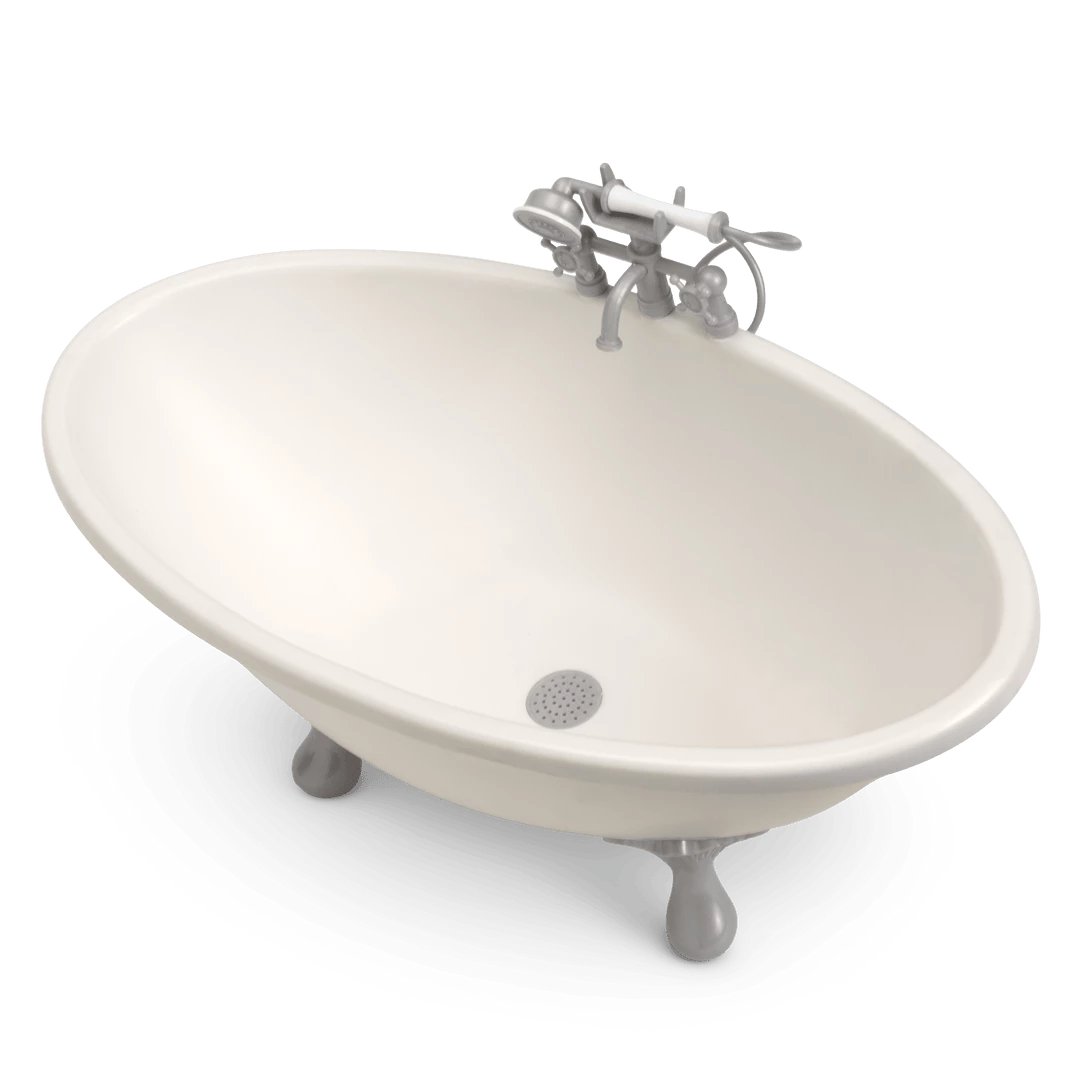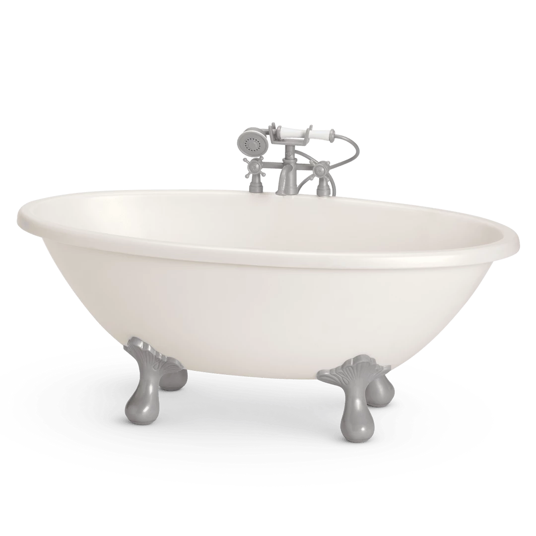- A claw-foot bathtub with turning faucet knobs and an adjustable showerhead