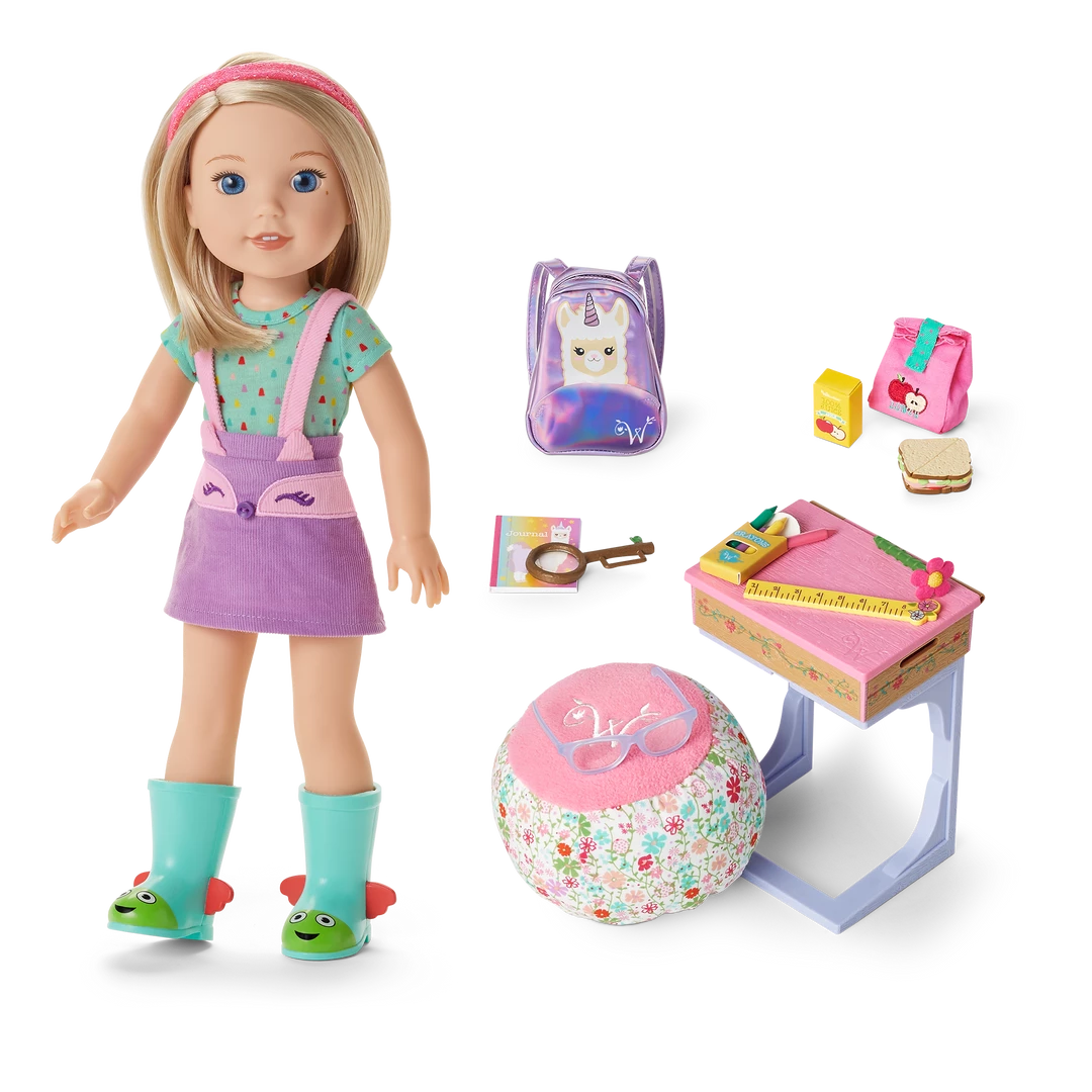 Everything your girl needs to play school with her WellieWishers™ doll! This set features the 14.5″ Camille™ doll dressed in the Smart as a Fox School Outfit and her signature wellie boots. It includes a desk with a floral cushion seat, a sack lunch, a llamacorn backpack, and school supplies.