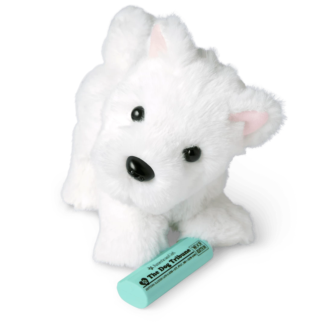 Coconut Chip™ is clever and loyal—she’ll stick by your side through thick and thin! This posable Westie Terrier dog has straight white fur, brown eyes, and a magnetic mouth for holding her newspaper toy. Plus, her box can be transformed into a pet house for the perfect napping spot after a day of play!