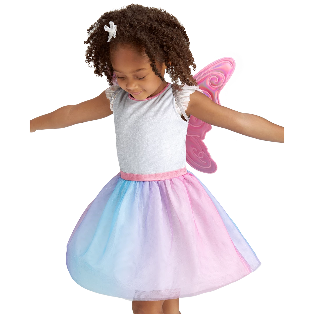 Your little one can transform into a magical butterfly in this back-zip tank dress with a sparkly white bodice, sparkly mesh flutter-sleeve detail, a multicolored sparkly mesh skirt, and a pink waistband and binding. For full fantasy effect, put on the pair of purple iridescent wings with embroidered swirl details and elastic arm straps.