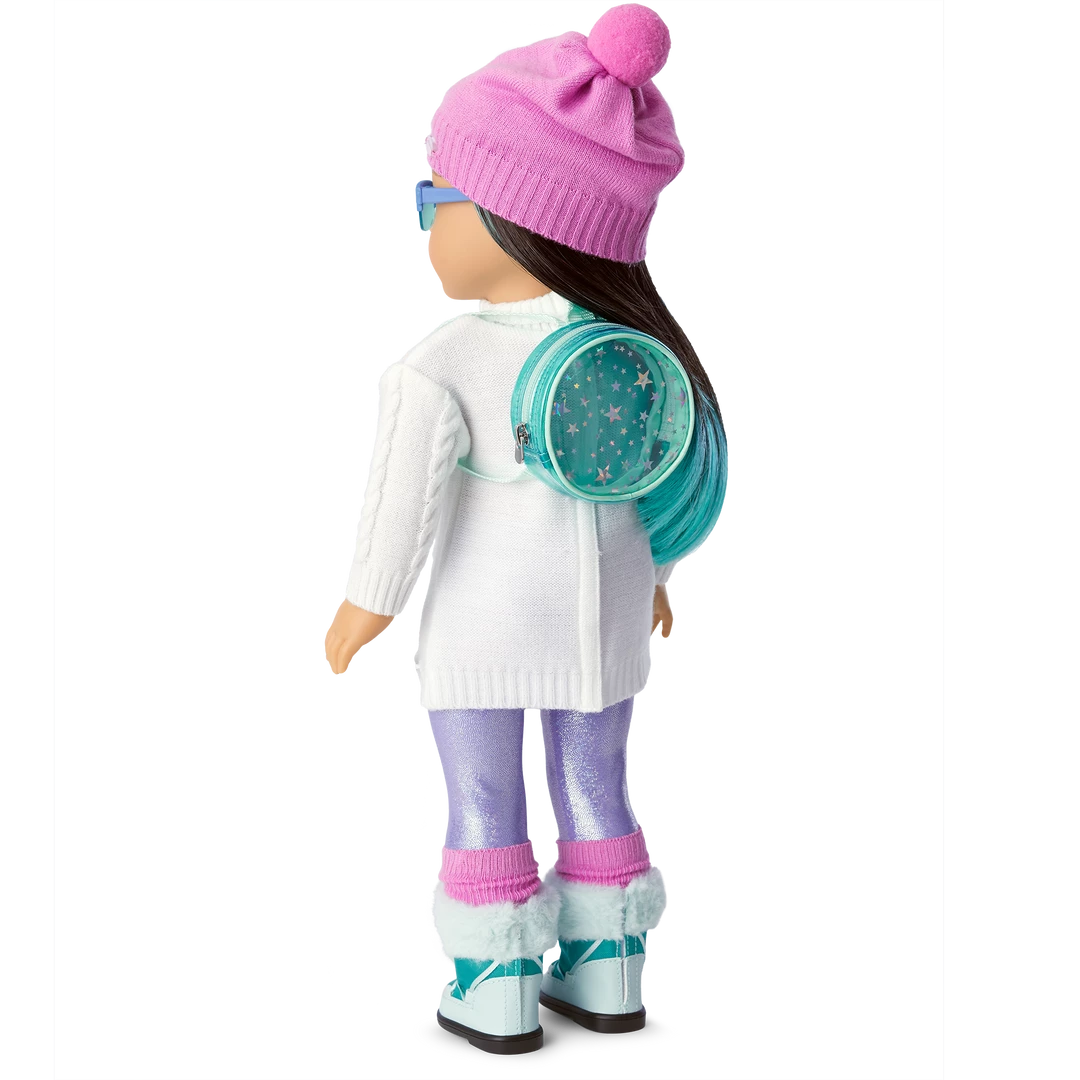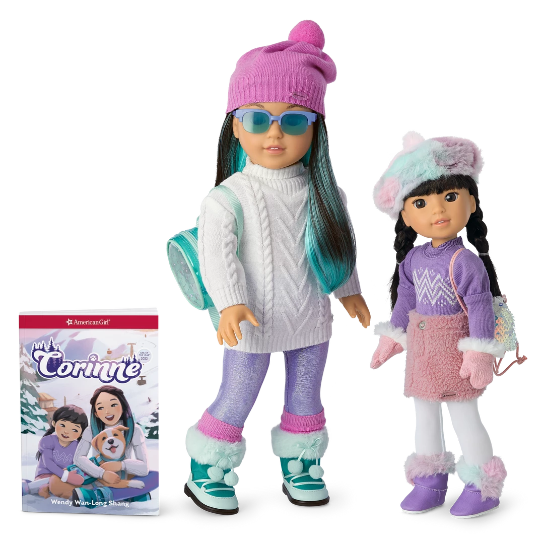 Corinne™ Doll & Book: The 18” Corinne™ doll has a huggable cloth body, a movable head and limbs made of smooth vinyl, brown eyes that open and close, and long, straight black hair with turquoise layers that can be brushed and styled. Corinne arrives wearing a mock turtleneck sweater, iridescent purple leggings, underwear, and blue boots with faux-fur trim. She includes the Corinne paperback book.
