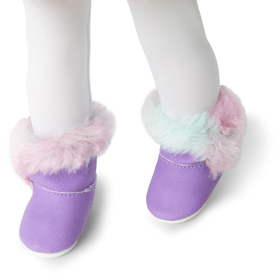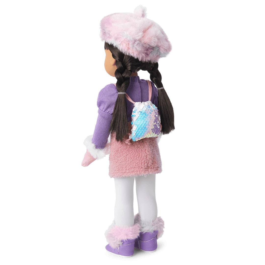 Gwynn™ Doll: The 14.5” Gwynn™ doll has brown eyes and long, braided black hair with bangs. Gwynn arrives wearing a purple knit sweater, a faux-fur skirt, white leggings, underwear, and purple boots with faux-fur trim.