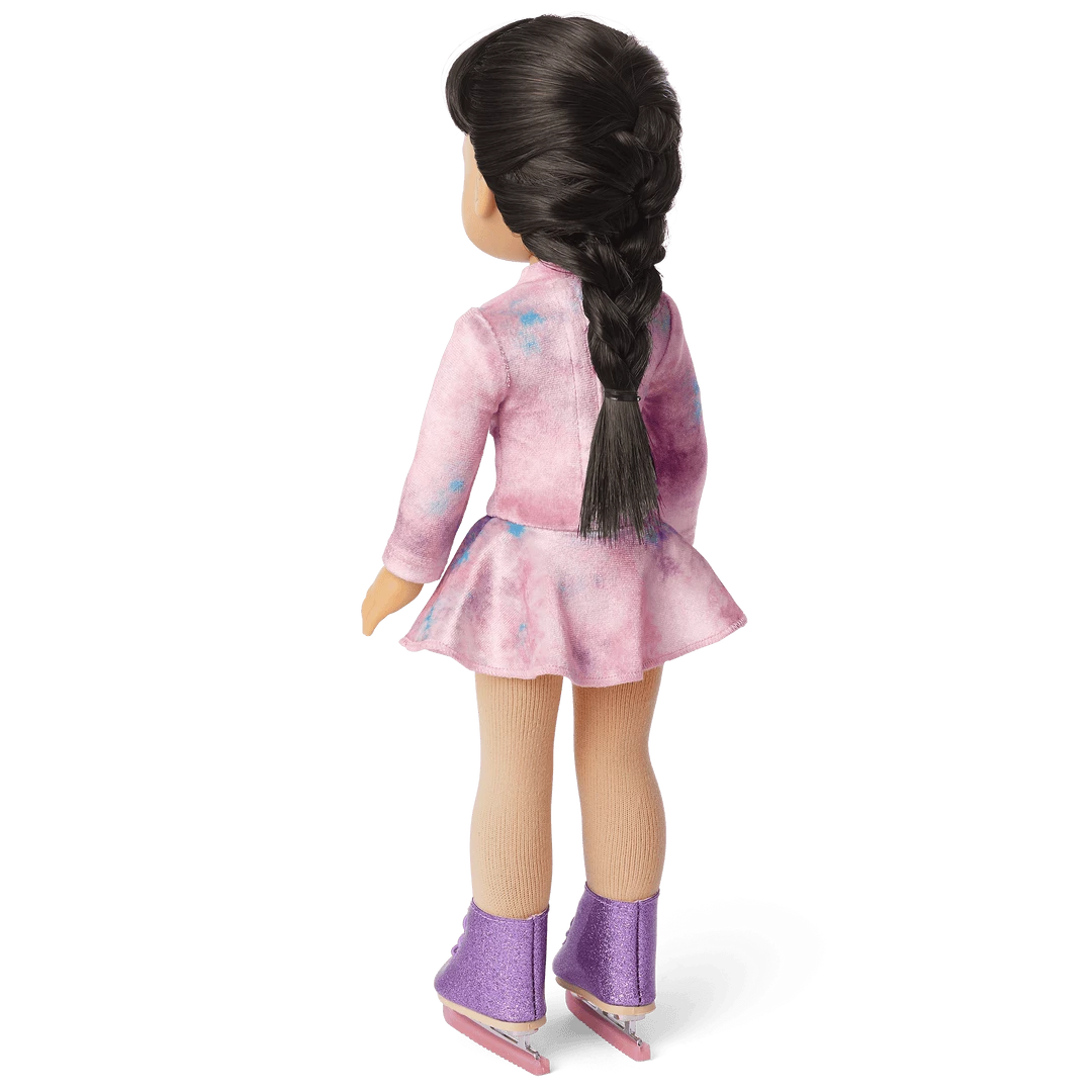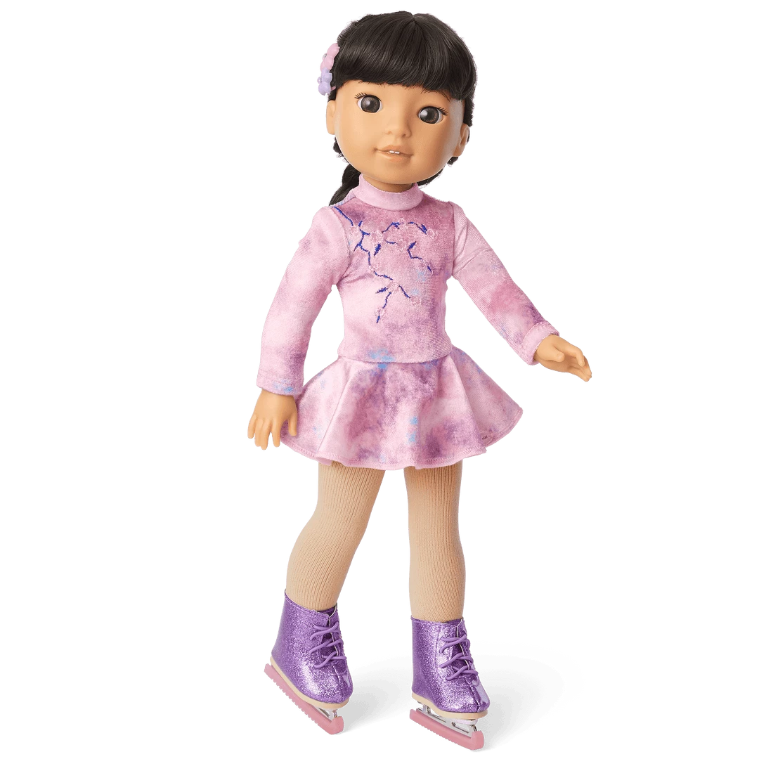 Gwynn’s™ Ice Skating Performance Outfit for 14.5-inch Dolls: A skate dress with embroidered cherry blossoms and built-in underwear, a flower hair clip, skate tights, ice skates with real metal blades, and removable skate guards