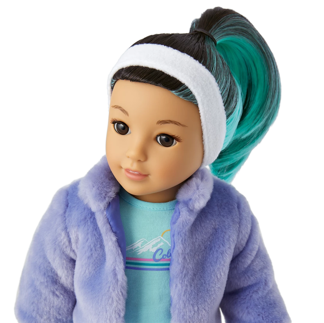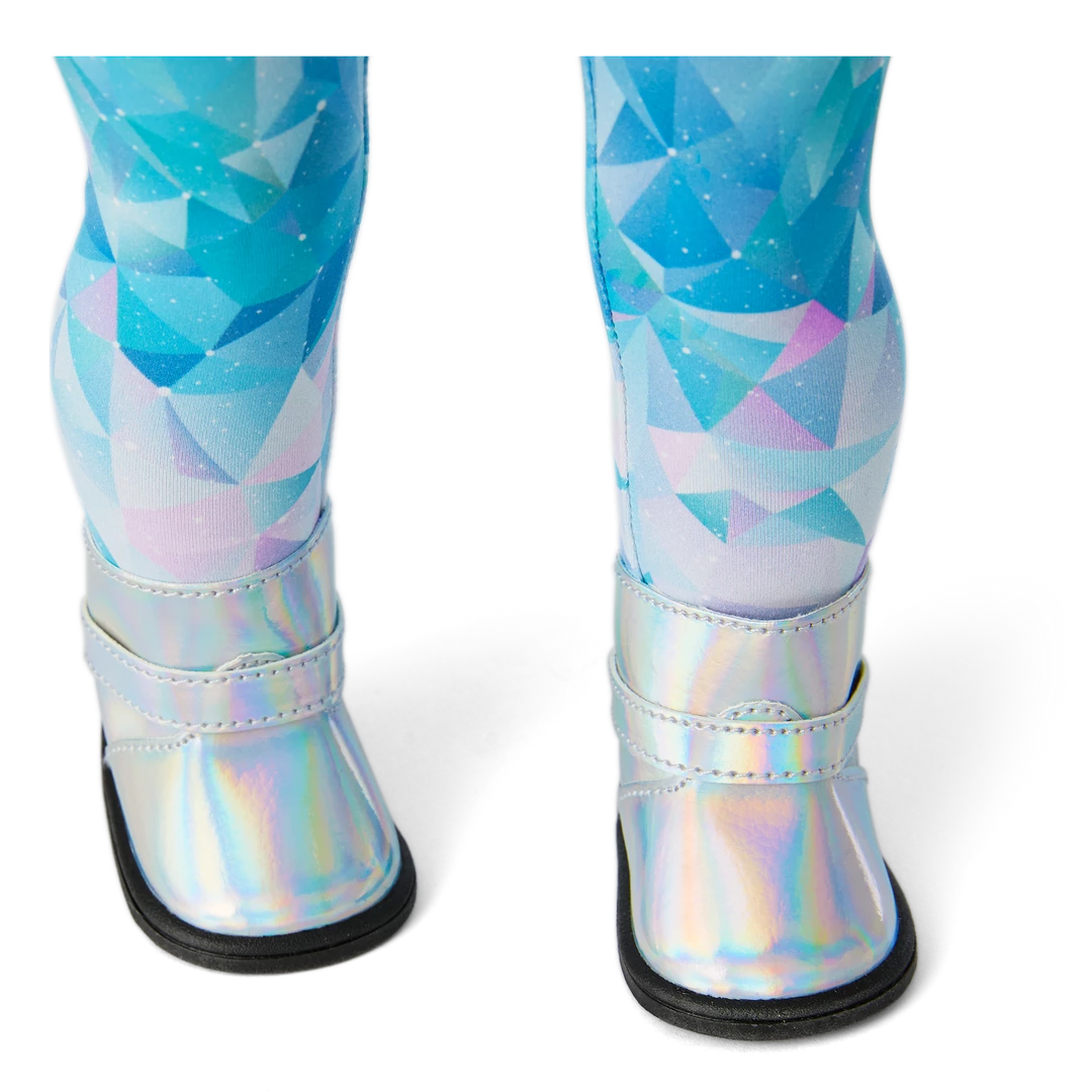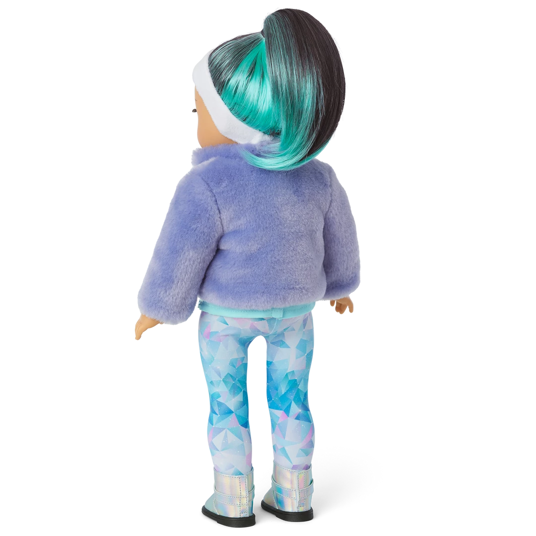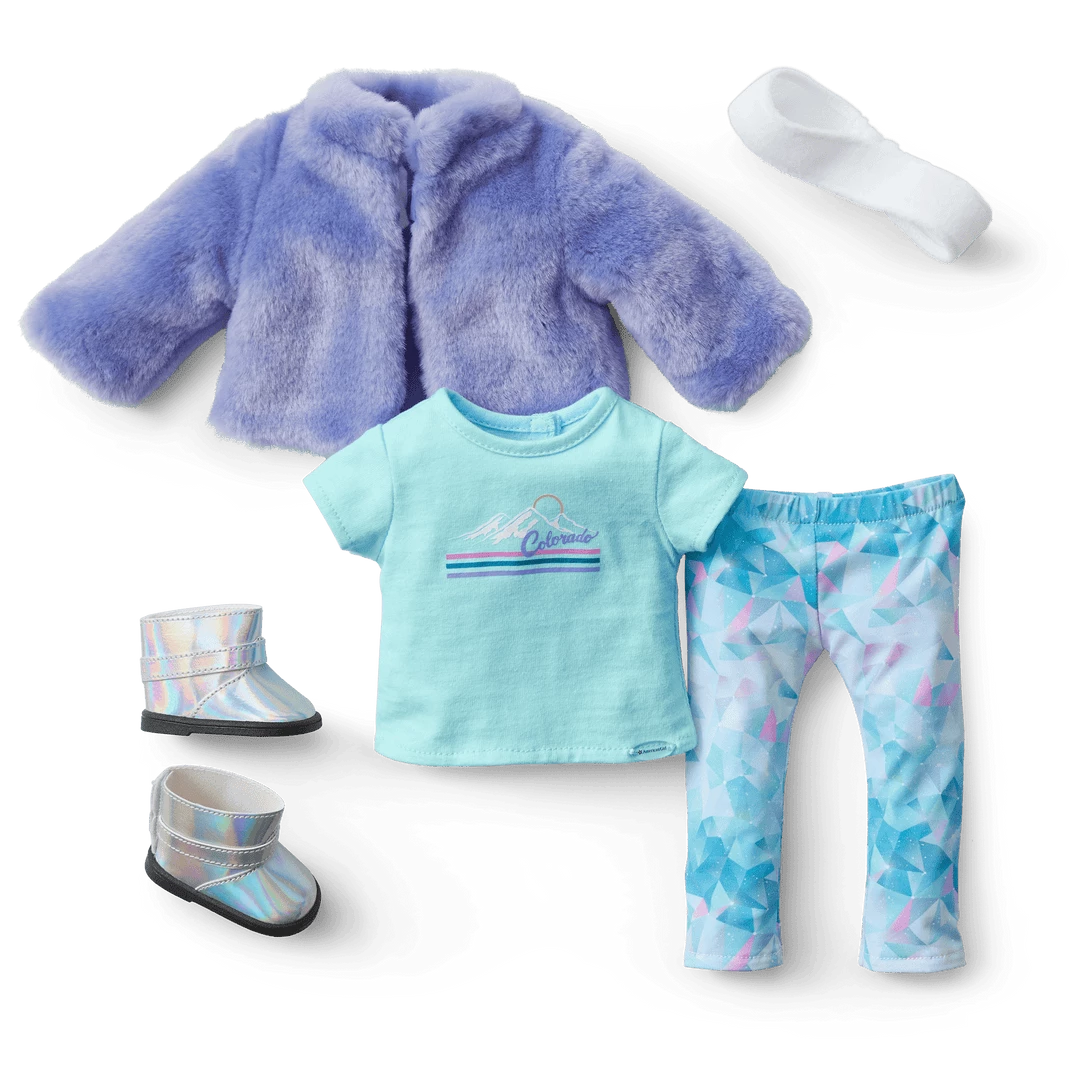 Corinne’s™ Casual Outfit for 18-inch Dolls: A faux-fur coat, a short-sleeved tee, leggings, a headband, and iridescent boots