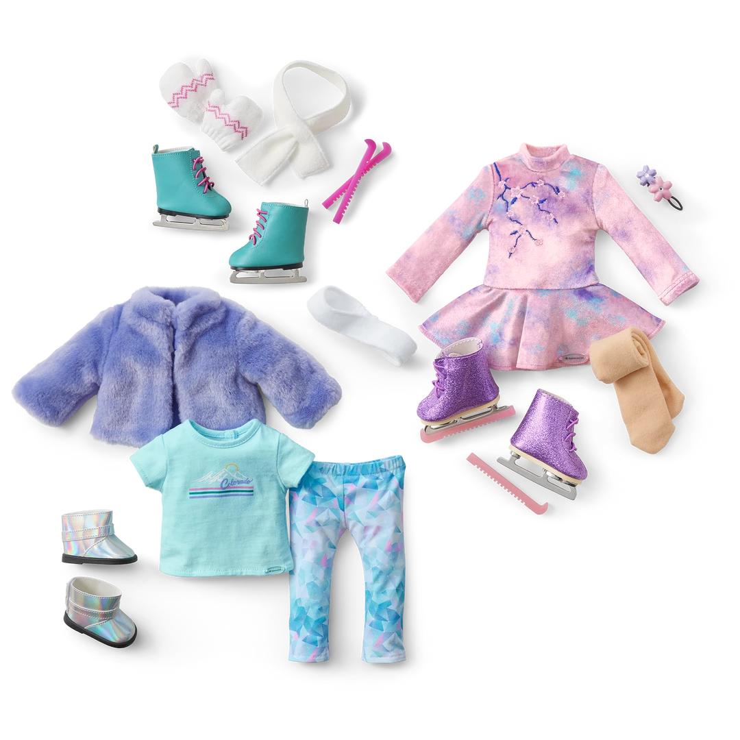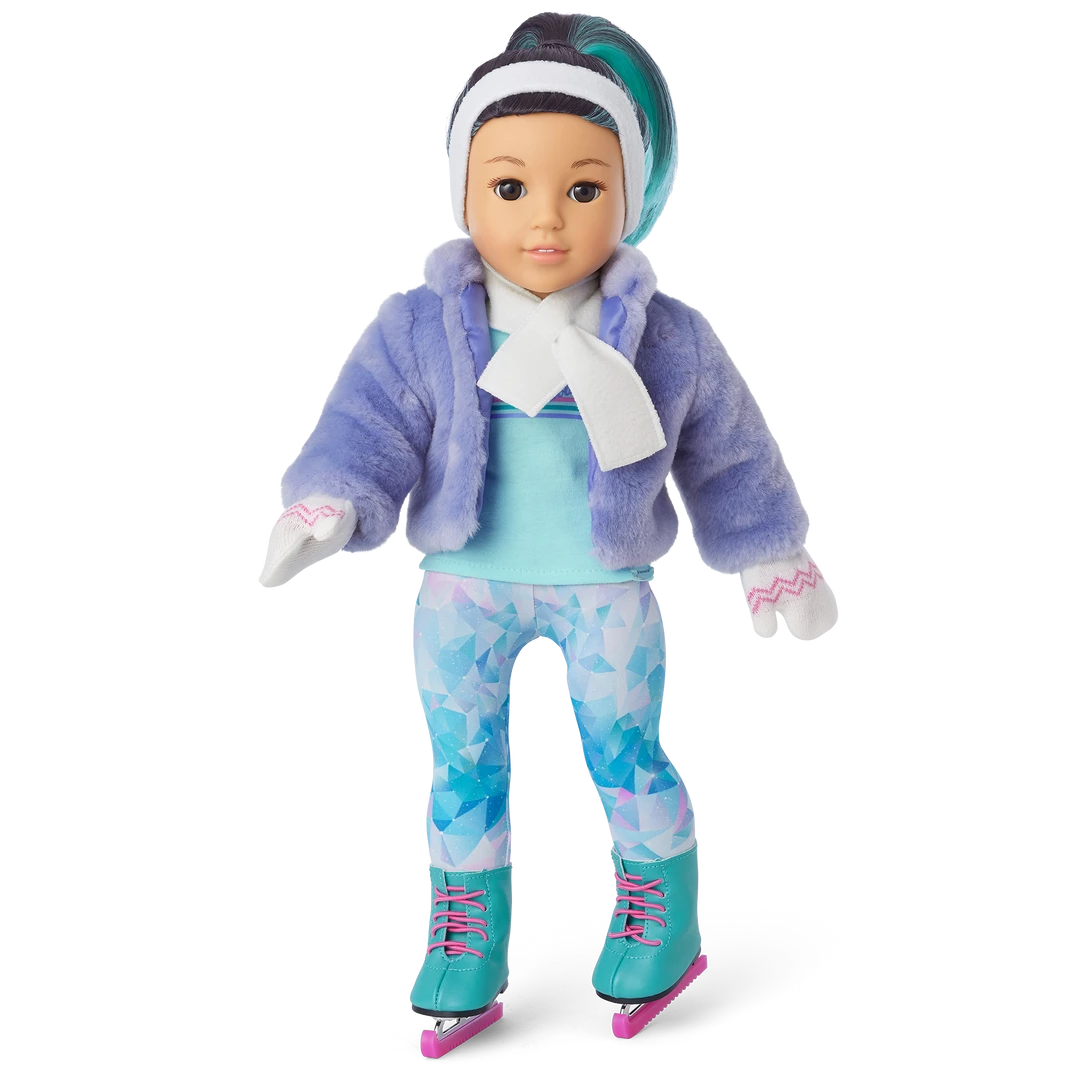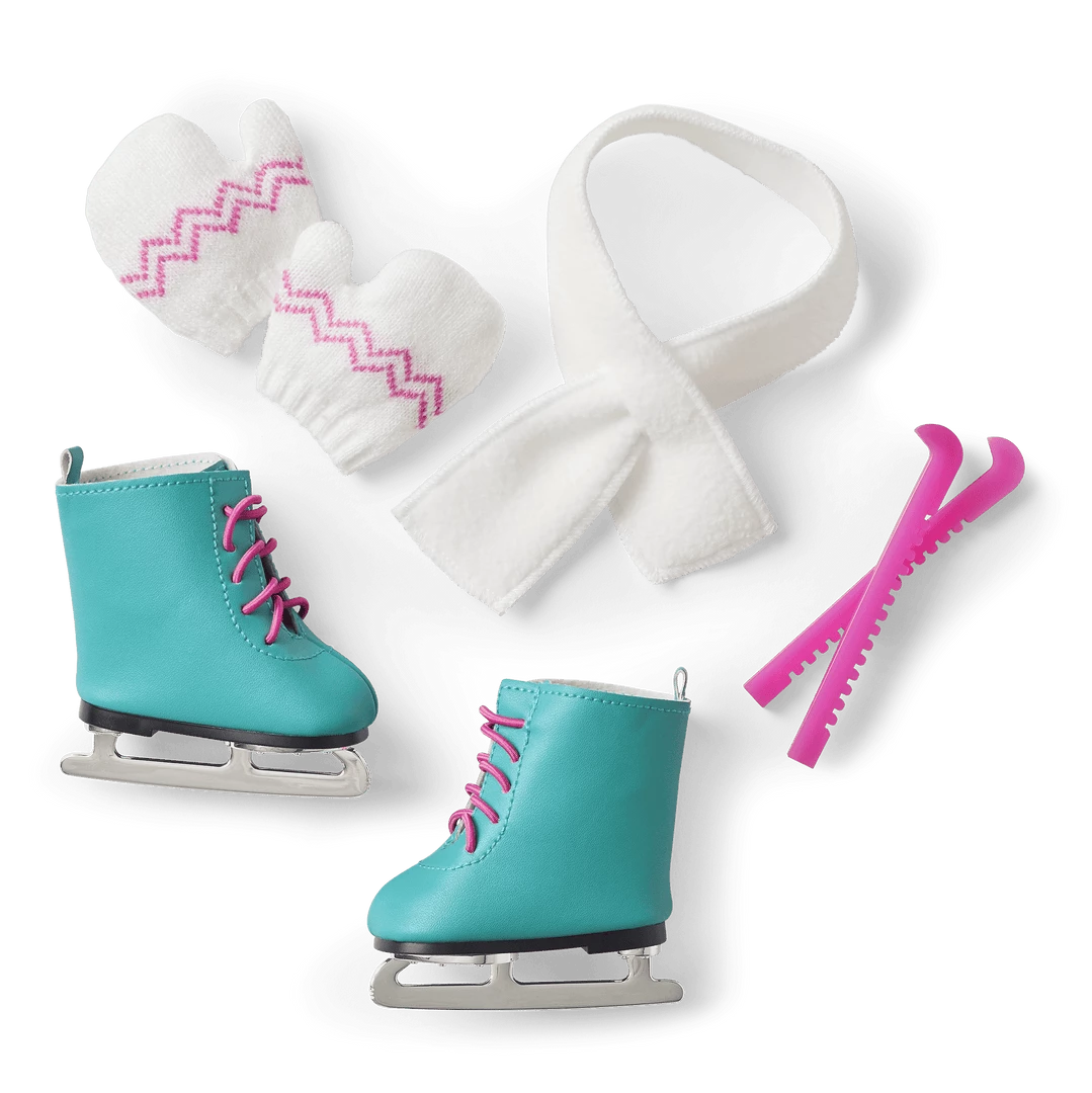 Corinne’s™ Ice Skating Accessories for 18-inch Dolls: A fleece pull-through scarf, mittens, blue ice skates with real metal blades, and removable skate guards