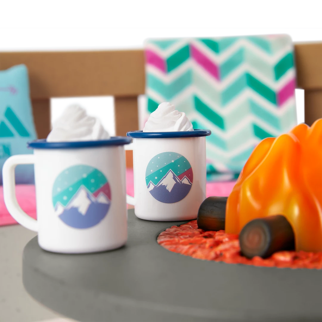 Corinne’s™ Ski Lodge Fire Pit: A faux fire pit with flickering LED flames that make crackling fire noises, a bench that fits both Corinne and Gwynn, a throw pillow, a blanket, two cocoa mugs, and an insulated bottle.