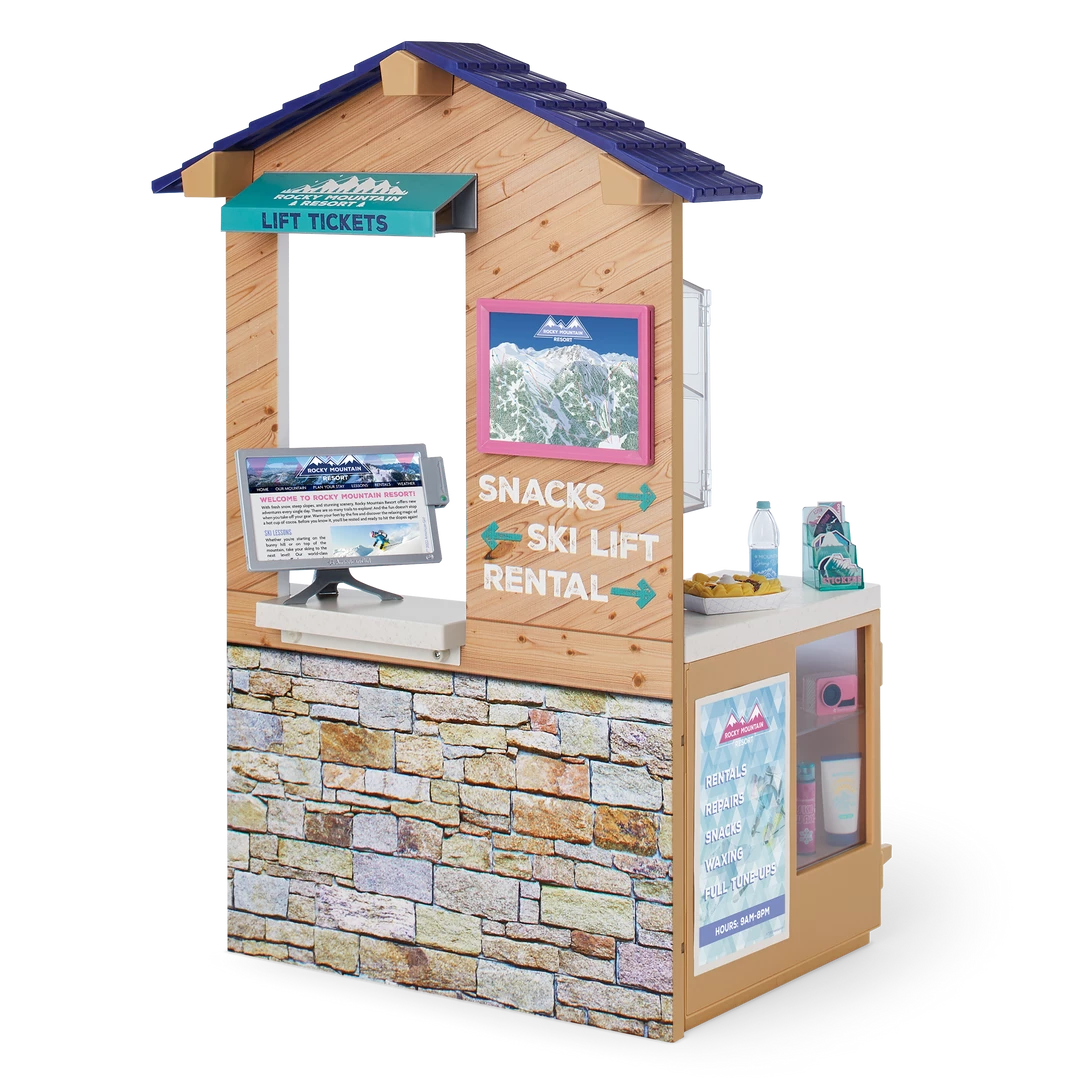 Corinne’s™ Ski & Snack Shop: A shop structure with a counter, roof, and awning; plenty of pretend snacks and fruit drinks to fuel up for a day on the slopes; a pretend computer and card swiper; pretend action camera; and ski accessories.