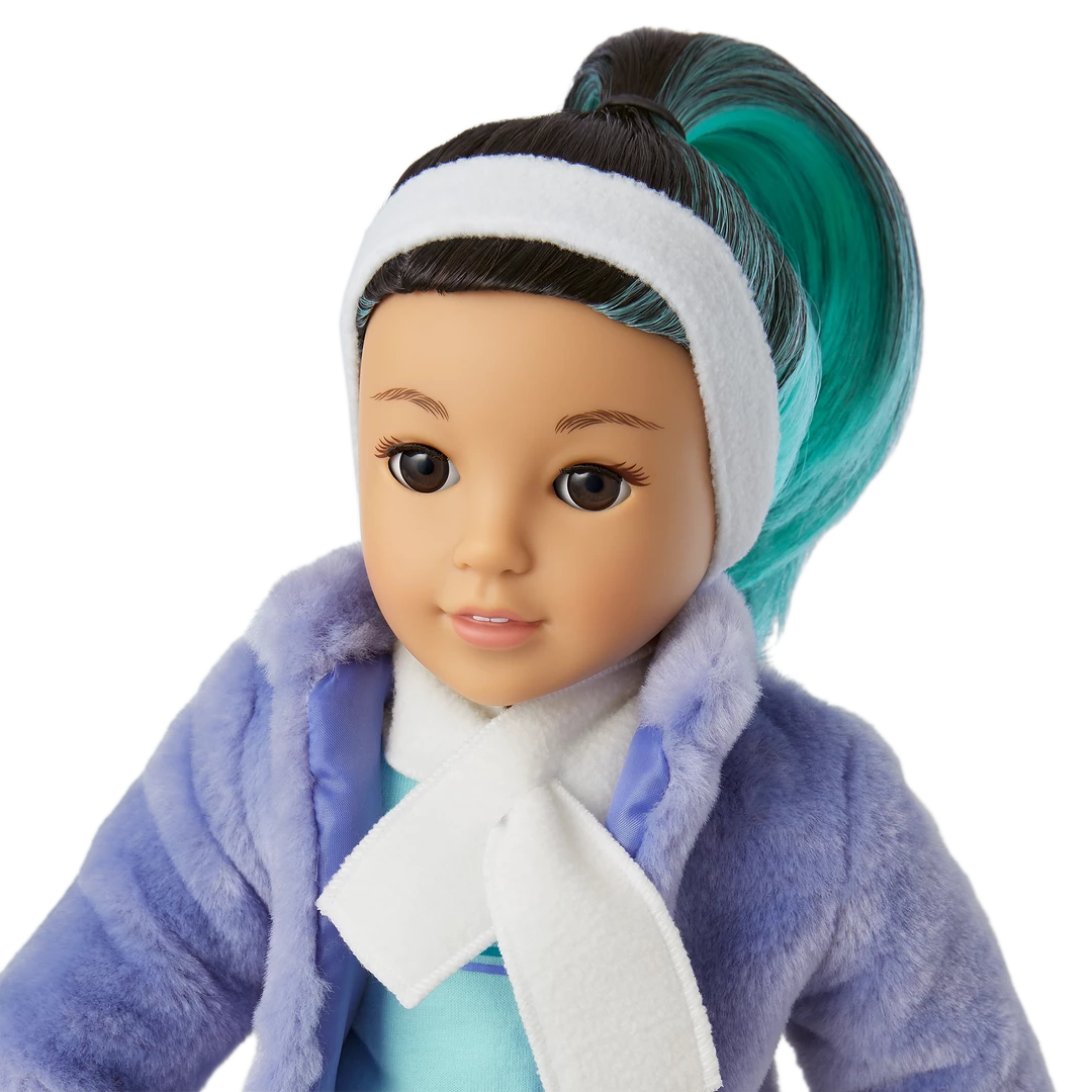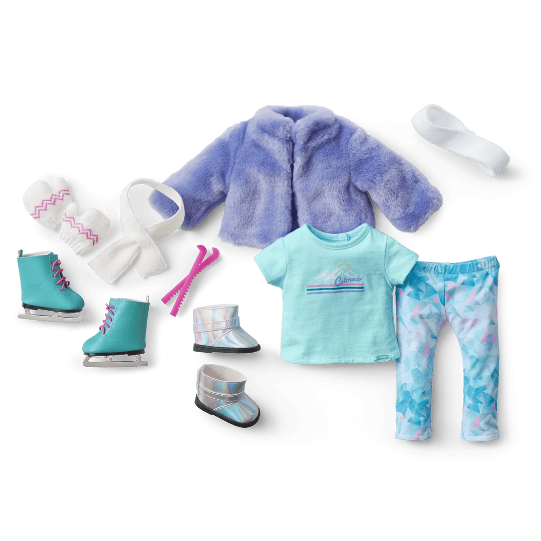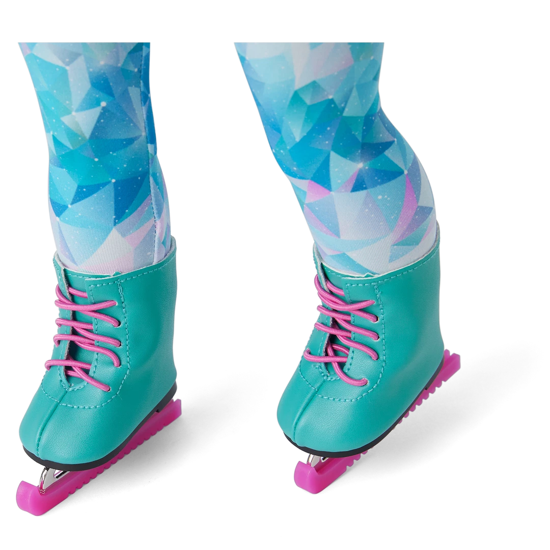 Corinne’s™ Ice Skating Accessories for 18-inch Dolls: A fleece pull-through scarf, mittens, blue ice skates with real metal blades, and removable skate guards