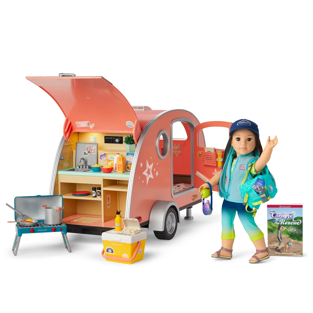 Get Outside Camper: A camper with a flip-down table, and a couch that converts to a bed that fits two dolls. The kitchen area has a countertop, flip-down sink, and shelves. There are working lights inside and a speaker that plays three songs and two nature sounds. The set also includes a mattress, camping gear, and plenty of play food.