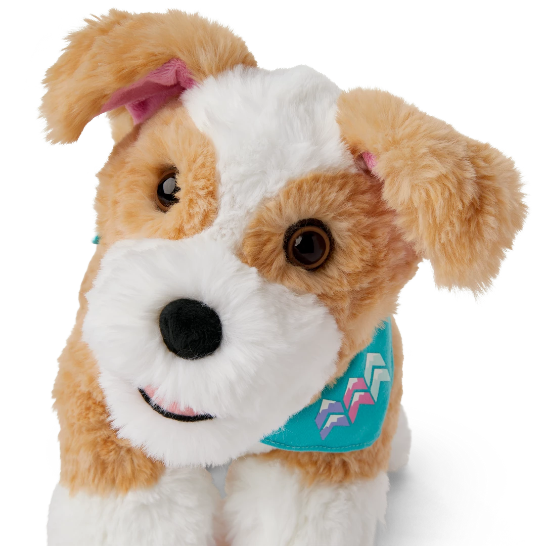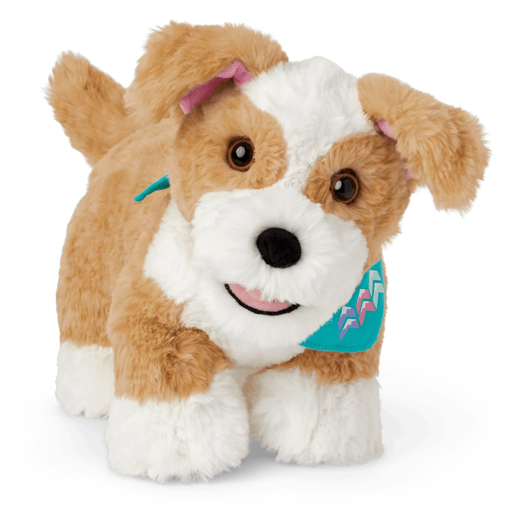 Flurry is a mixed-breed dog in training to be a search-and-rescue dog. This girl-sized plush has tan-and-white fur and movable limbs so she can sit or lie down. She has a knotted bandanna around her neck with a mountain graphic, and soft pink ears and paw pads. Girls will love her sweet brown eyes, open mouth with her tongue showing, and the embroidered American Girl® star on her back foot. Everyone will love that she’s made with more sustainable materials.