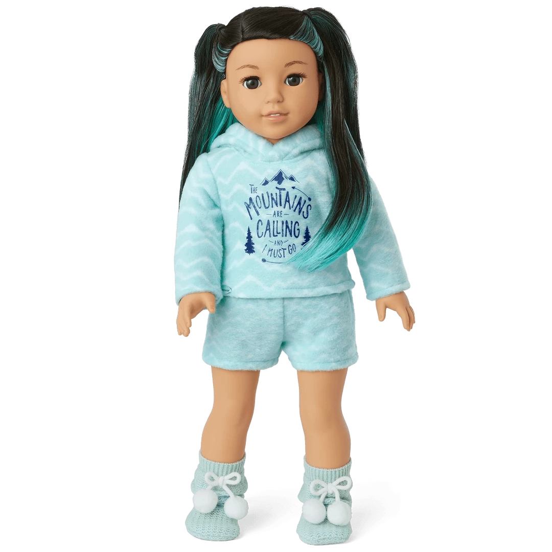 - A fuzzy light-blue fleece hooded sweatshirt with an allover mountain print and a “Mountains Are Calling” graphic