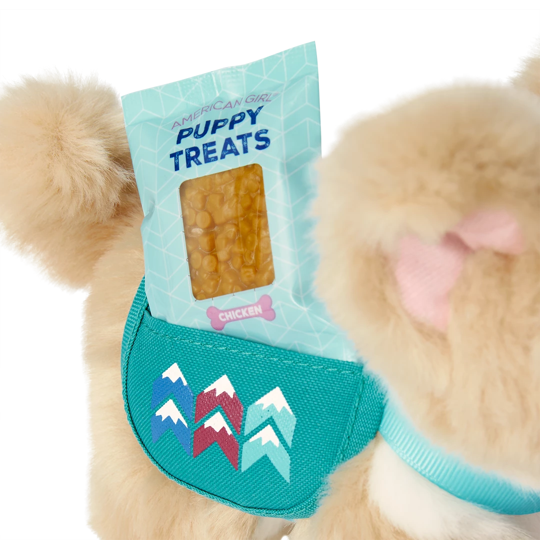 Corinne’s™ Dog with Backpack: A plush tan-and-white dog, a dog backpack, a ball thrower toy, and pretend dog treats