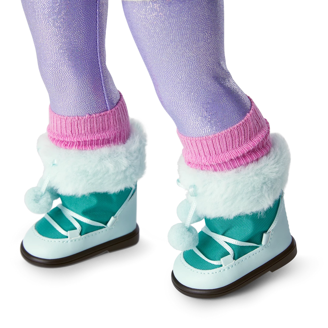 Corinne’s™ Ski Outfit for 18-inch Dolls: A puffy jacket with a zip front and faux fur on the hood, puffy ski pants, a headband, purple gloves with faux-fur trim, and cozy pink socks